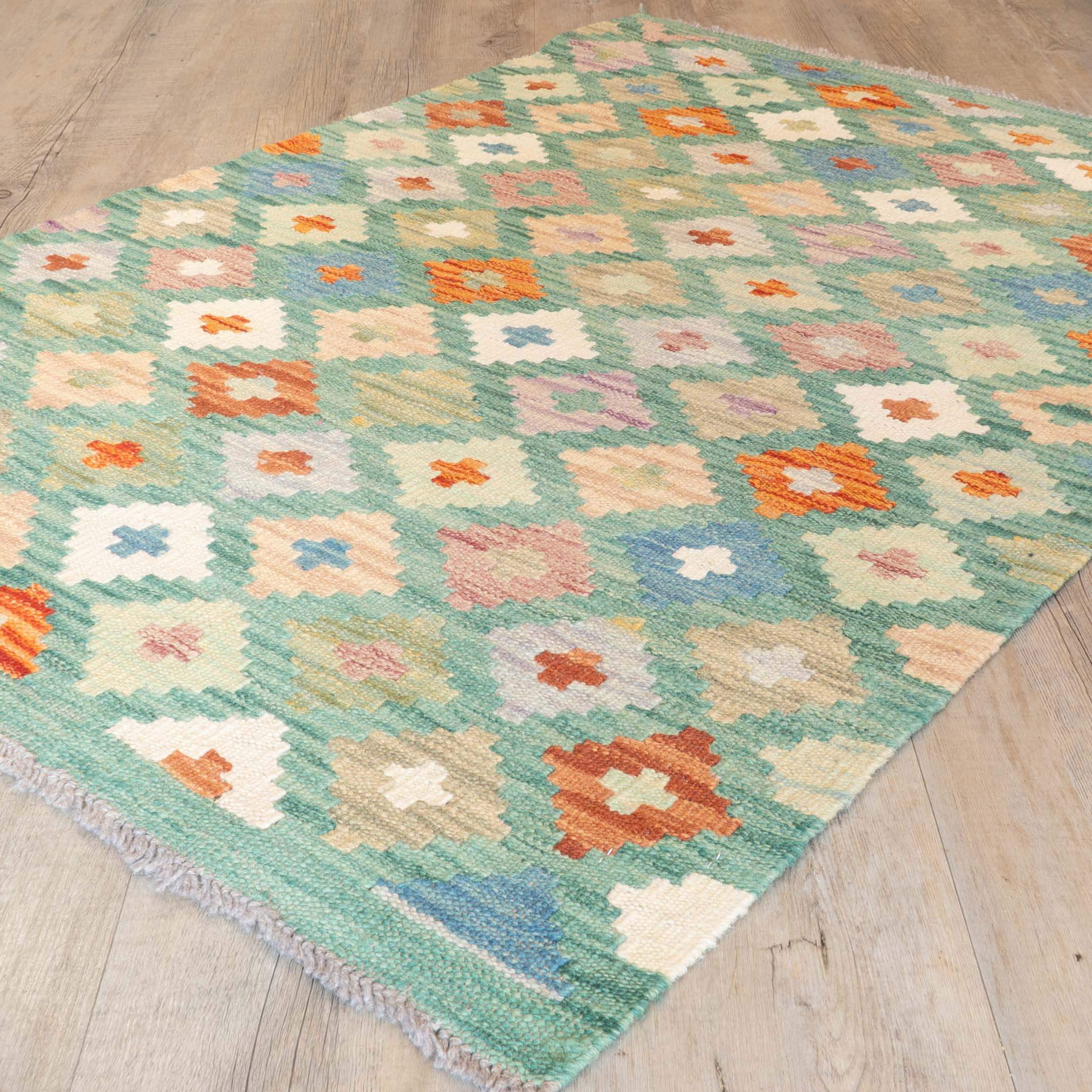 Experience the quality and tradition of Afghan craftsmanship with our handmade Kilim in soft colours with a small pattern. This flat-weave kilim is woven from traditional, vegetable-dyed wool, making it durable and ideal for use with underfloor heating. Its colourful and striking design is reversible, allowing it to be used as a floor covering, wall hanging, or throw. Upgrade your space with this beautiful and inexpensive piece.