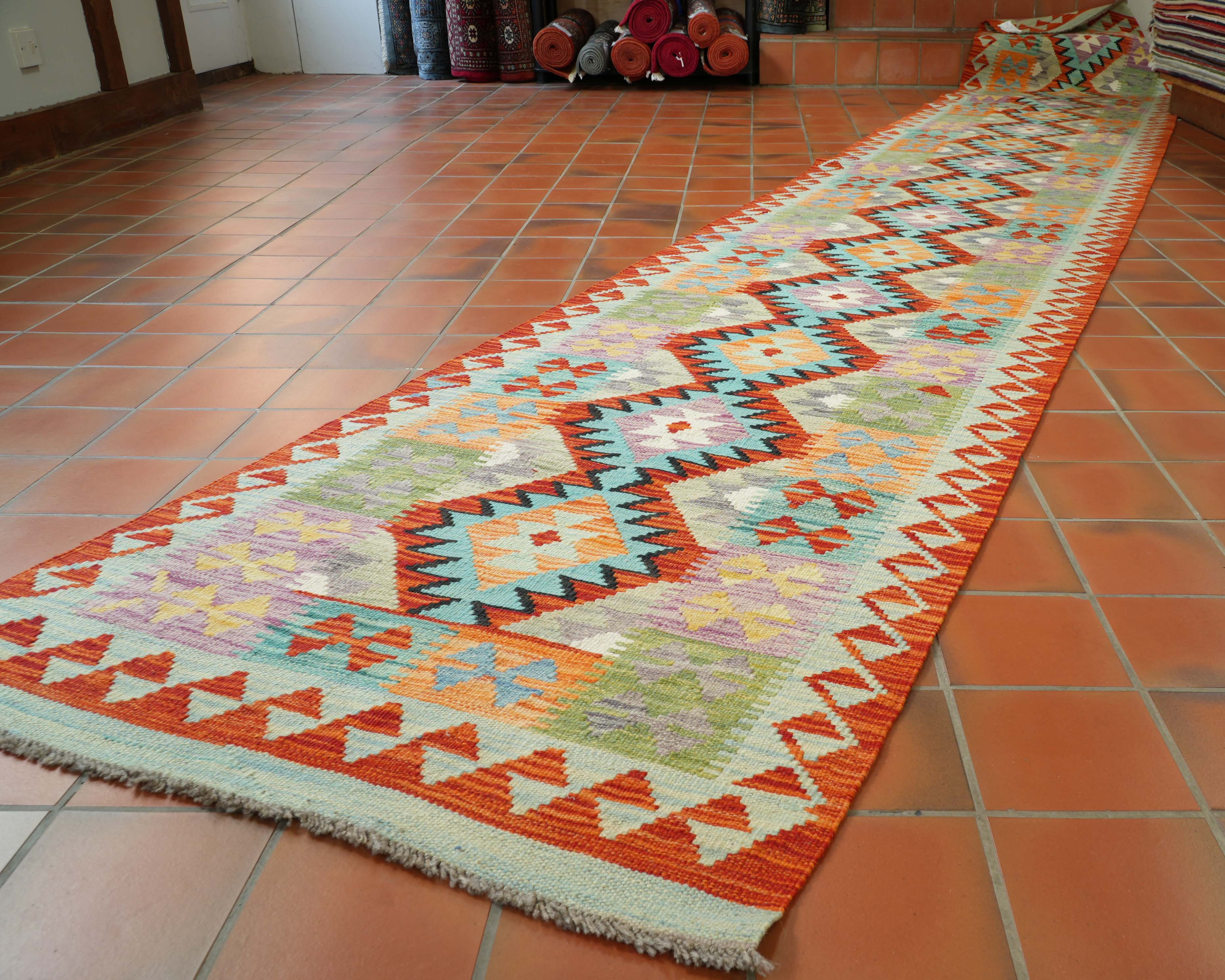 This long runner, expertly crafted by skilled artisans in Afghanistan, features a traditional geometric design and vibrant colours. Made from vegetable-dyed wool, it is not only environmentally friendly but also suitable for use with underfloor heating. Its reversible design allows for versatility in styling, making it a budget-friendly and eye-catching addition to any floor. Please click the hyperlinks in gold if you are interested in additional information.Kilim rugs are serviceable and practical, giving the owner the advantage of being made from one of the most beautiful natural yarns, 'wool', and are often completely reversible. The vegetable-dyed wool is a beautiful natural fibre that usually...