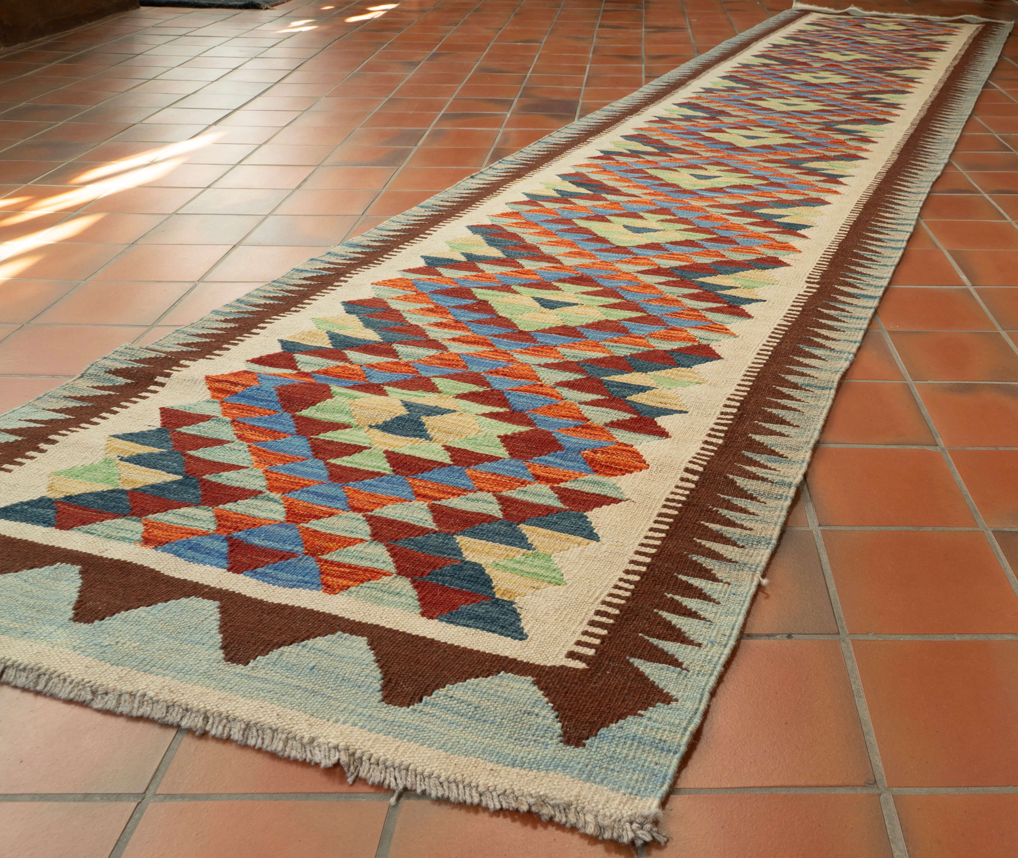 This flat weave kilim is woven with traditional vegetable-dyed wool, making it durable and perfect for use with underfloor heating. Its colourful and striking design is reversible, allowing it to be used as a floor covering, wall hanging, or throw. Upgrade your space with this beautiful and inexpensive piece.