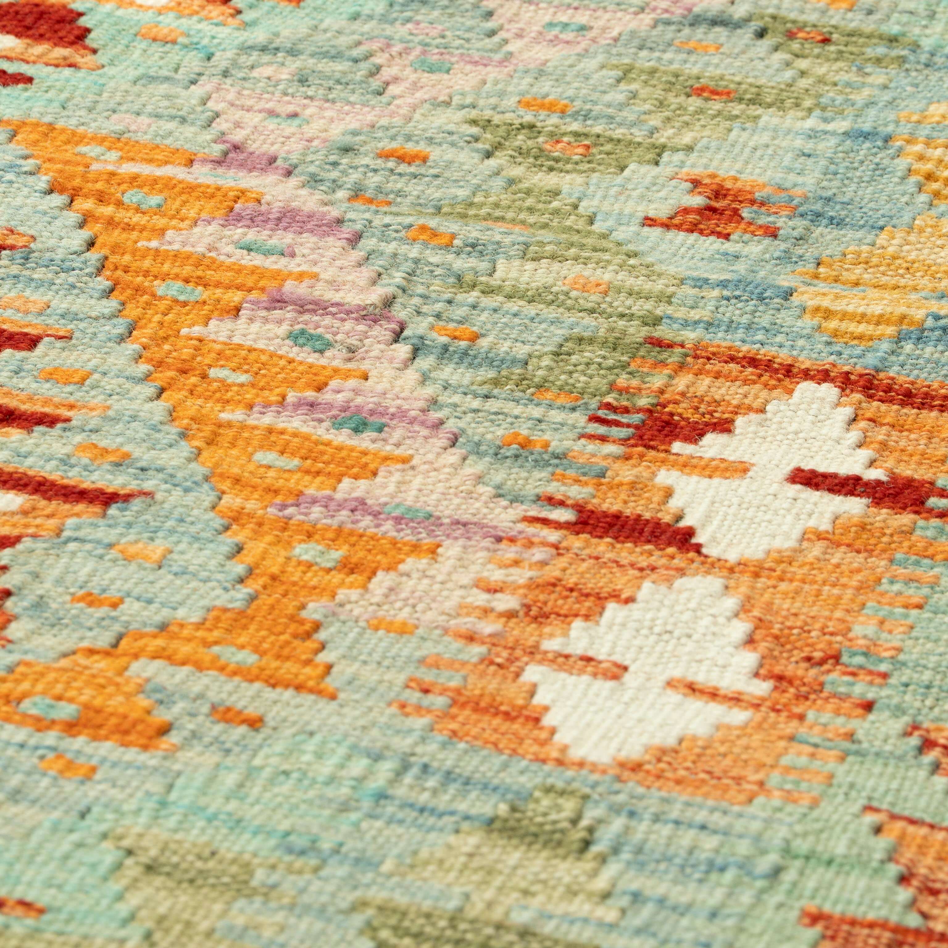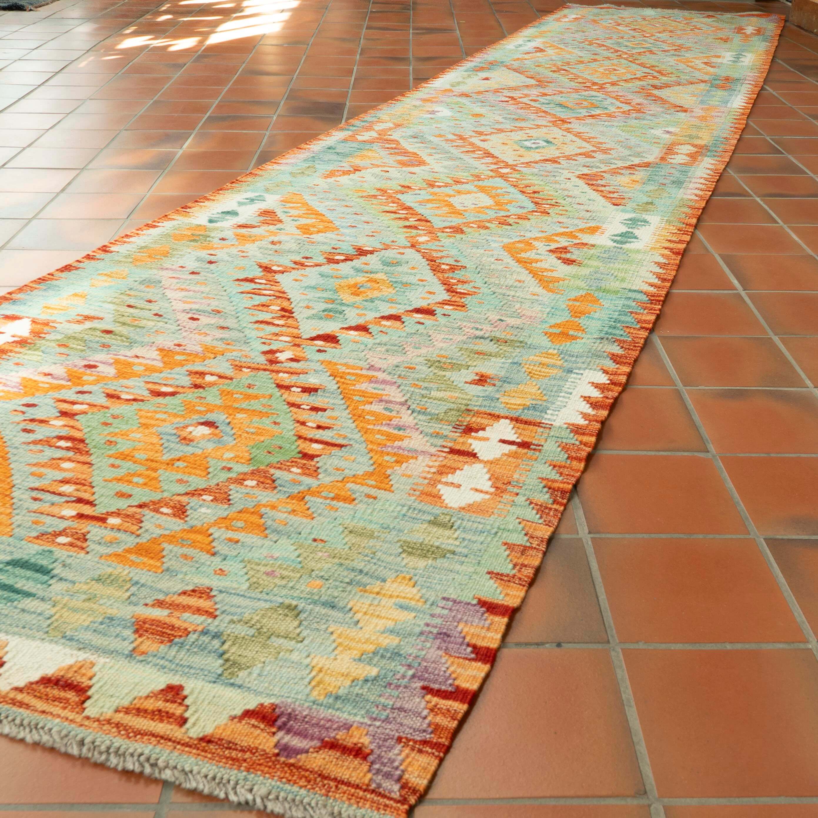 Experience the quality and tradition of Afghan craftsmanship with our extra-long handmade Kilim in soft green. This flat weave kilim is woven with traditional vegetable-dyed wool, making it durable and perfect for use with underfloor heating. Its colourful and striking design is reversible, allowing it to be used as a floor covering, wall hanging, or throw. Upgrade your space with this beautiful and inexpensive piece.