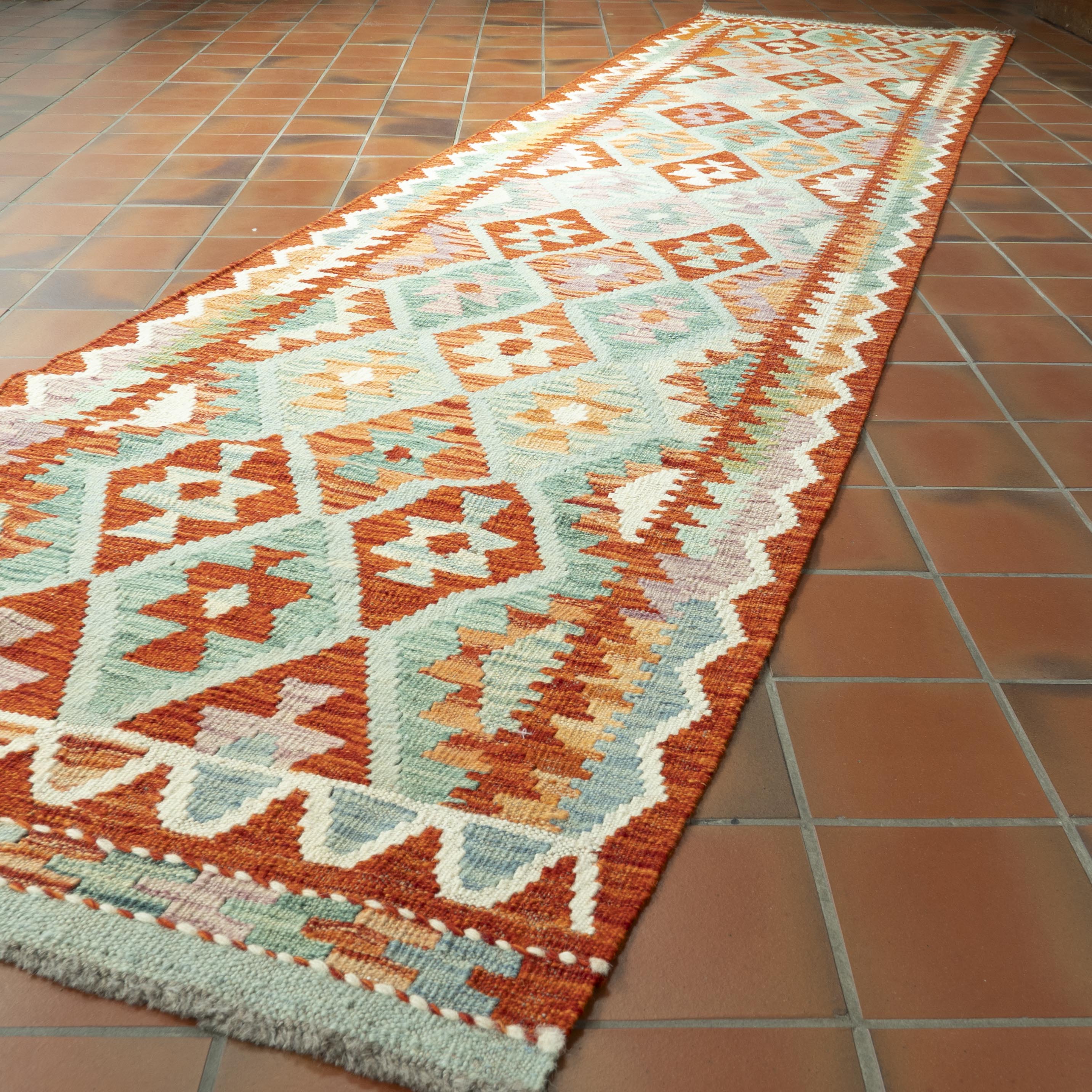 Experience the quality and tradition of Afghan craftsmanship with our handmade long Kilim runner. This flat-weave kilim is woven from traditional, vegetable-dyed wool, making it durable and ideal for use with underfloor heating. Its colourful and striking design is reversible, allowing it to be used as a floor covering, wall hanging, or throw. Upgrade your space with this beautiful and inexpensive piece—positive colourings in terracotta and green.