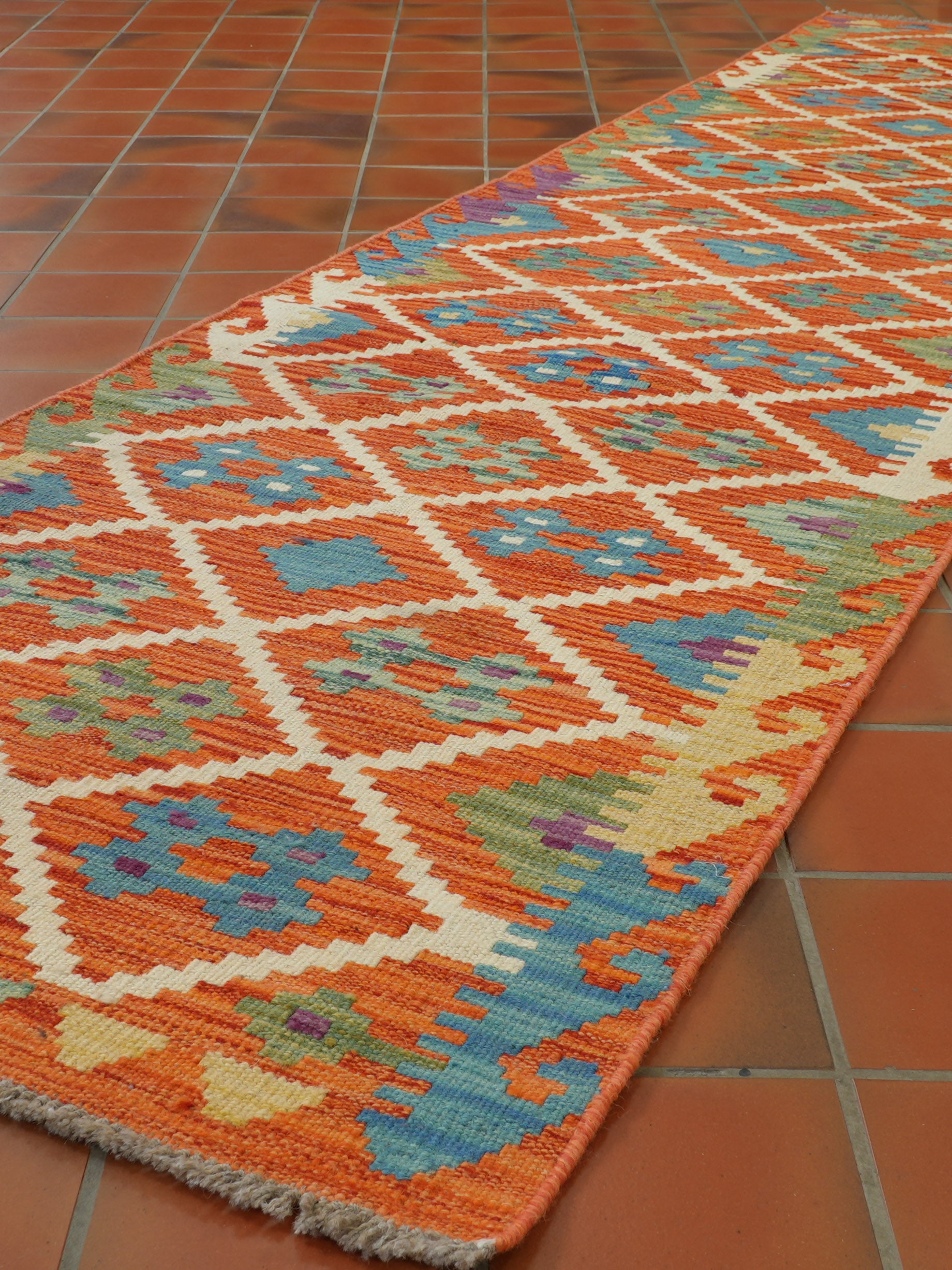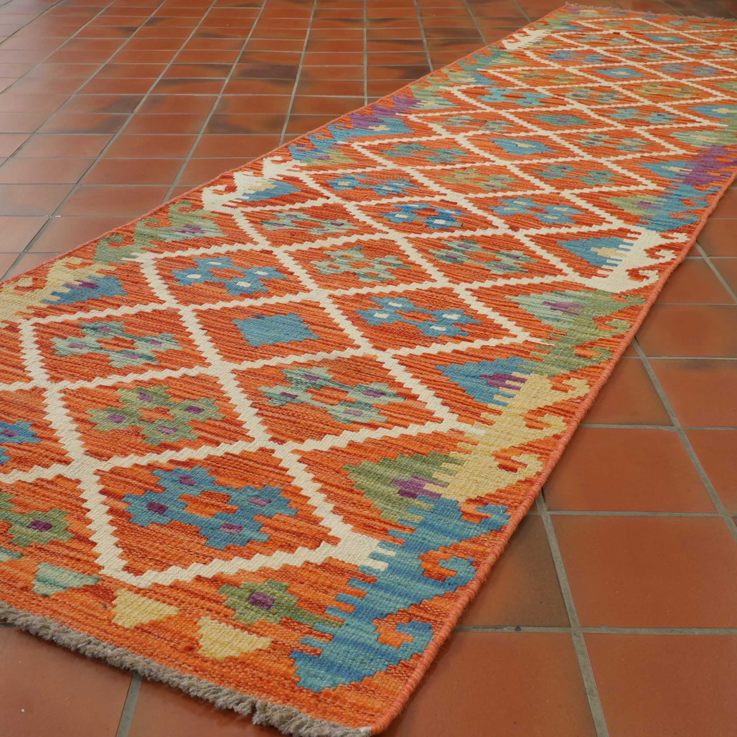 Experience the quality and tradition of Afghan craftsmanship with our handmade Kilim. This flat weave kilim is woven with traditional vegetable-dyed wool, making it durable and perfect for use with underfloor heating. Its colourful and striking design is reversible, allowing it to be used as a floor covering, wall hanging, or throw. Upgrade your space with this beautiful and inexpensive piece.