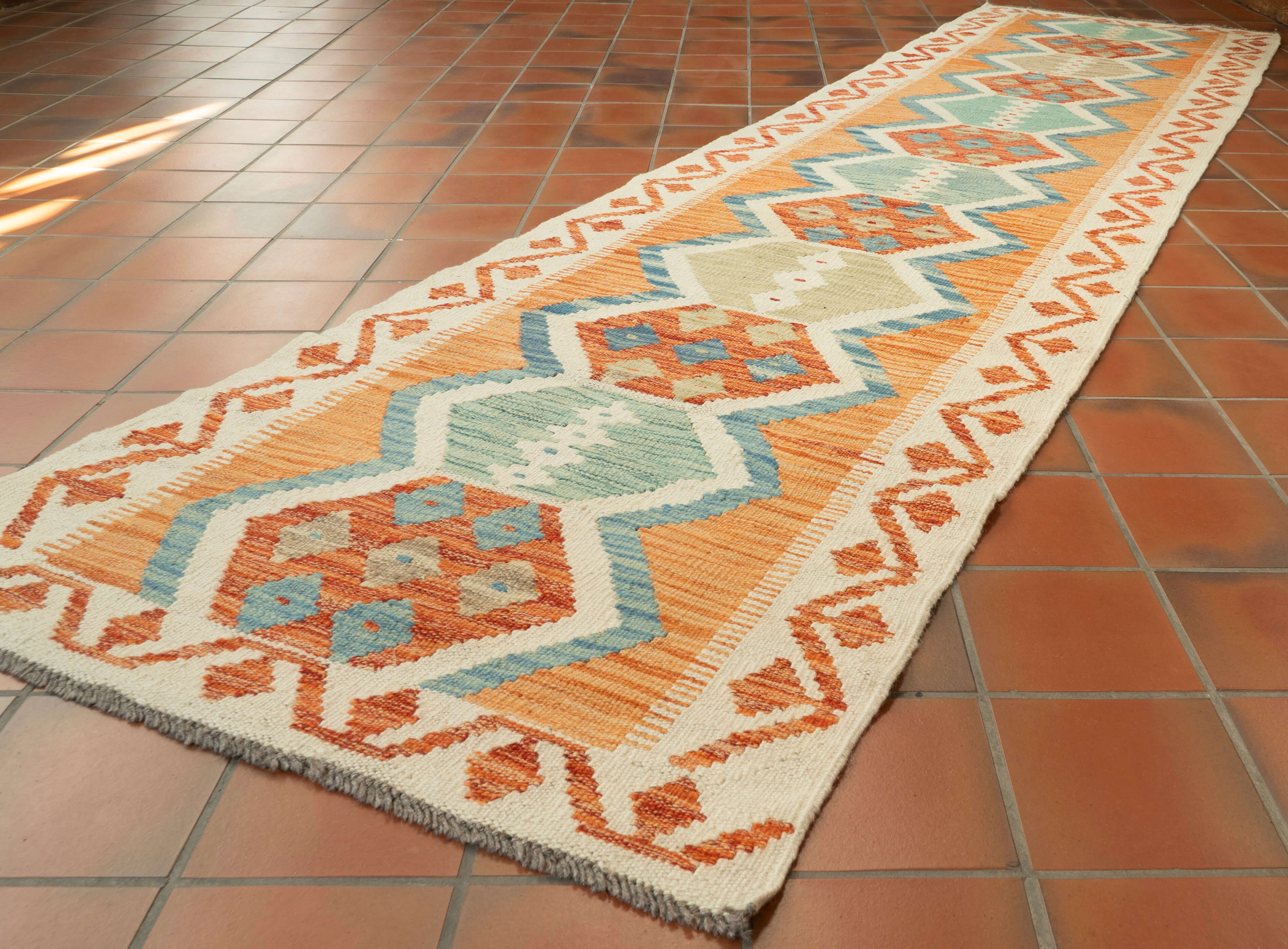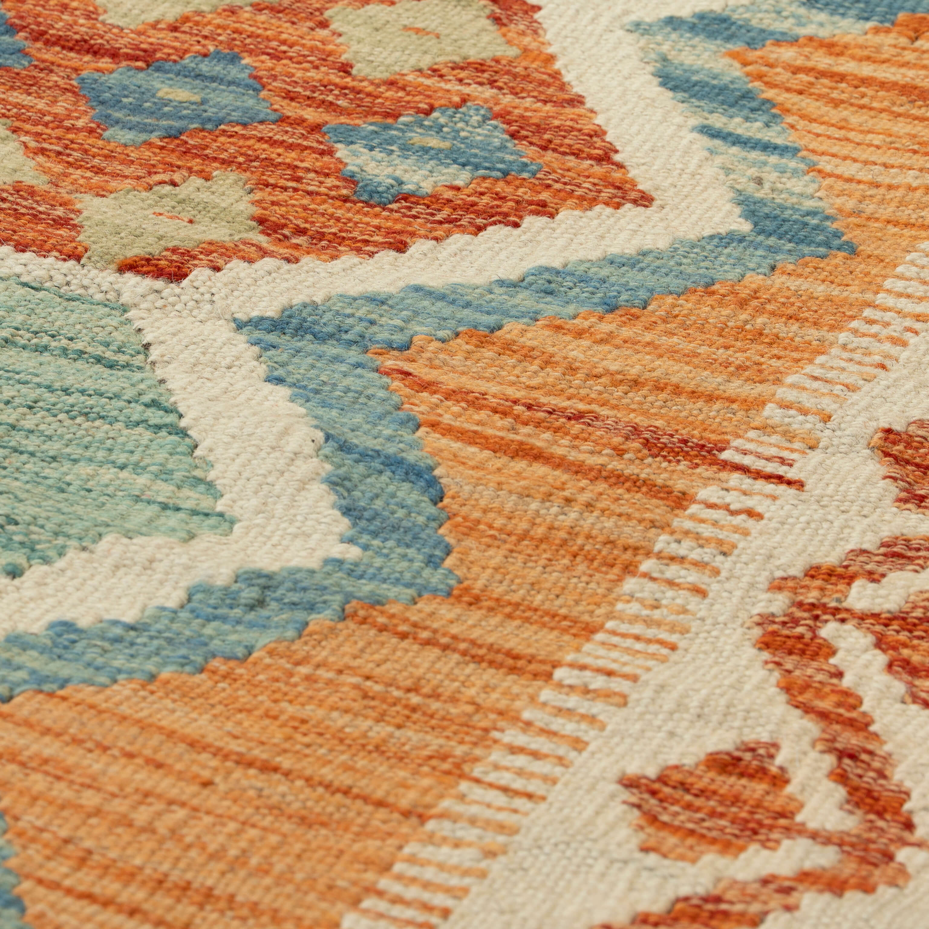 Experience the quality and tradition of Afghan craftsmanship with our handmade Kilim runner. This flat weave kilim is woven with traditional vegetable-dyed wool, making it durable and perfect for use with underfloor heating. Its colourful and striking design is reversible, allowing it to be used as a floor covering, wall hanging, or throw. Upgrade your space with this beautiful and inexpensive piece.