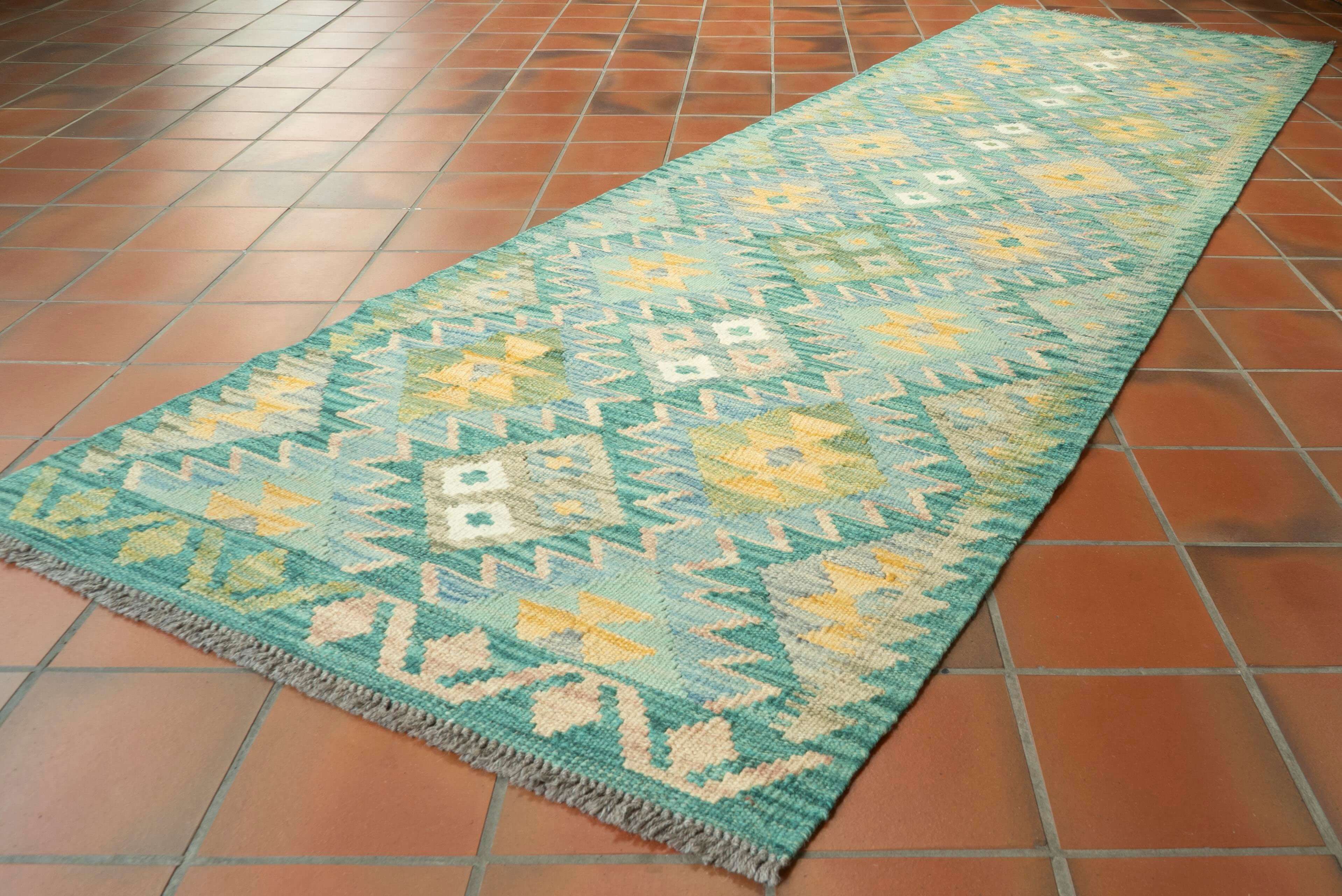 Experience the quality and tradition of Afghan craftsmanship with our handmade short Kilim runner in vibrant green and pale gold. This flat-weave kilim is woven from traditional, vegetable-dyed wool, making it durable and ideal for use with underfloor heating. Its colourful and striking design is reversible, allowing it to be used as a floor covering, wall hanging, or throw. Upgrade your space with this beautiful and inexpensive piece.