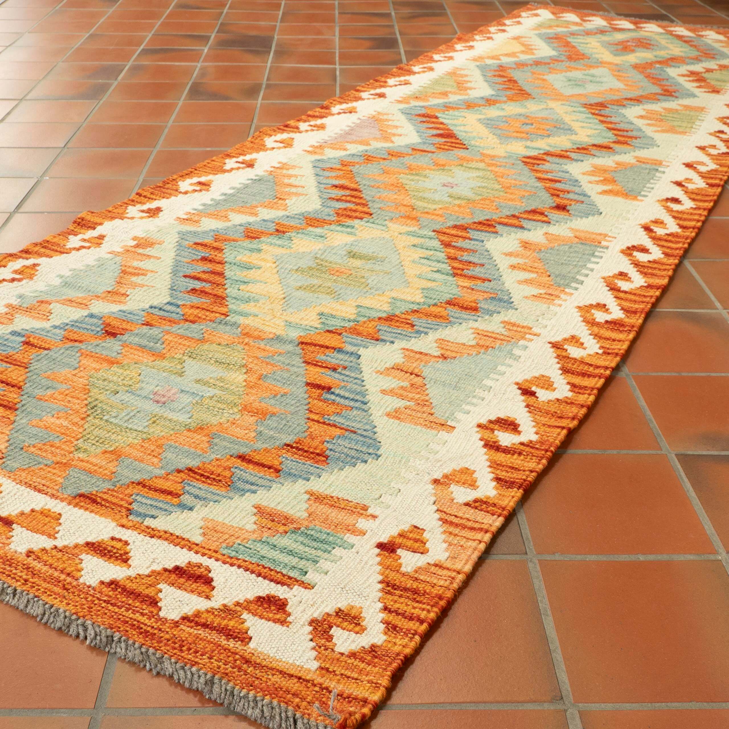 Experience the quality and tradition of Afghan craftsmanship with our handmade Kilim runner in terracotta and green. This flat-weave kilim is woven from traditional, vegetable-dyed wool, making it durable and ideal for use with underfloor heating. Its colourful and striking design is reversible, allowing it to be used as a floor covering, wall hanging, or throw. Upgrade your space with this beautiful and inexpensive piece.