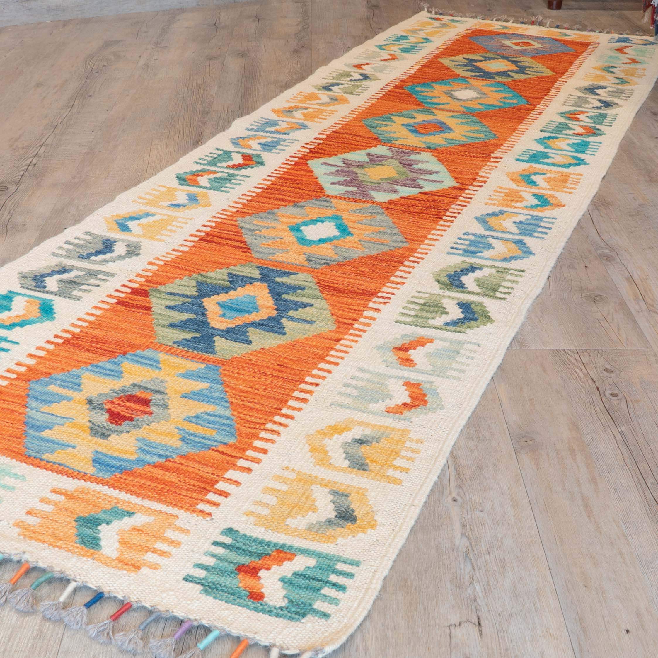 Experience the quality and tradition of Afghan craftsmanship with our cheerful handmade short Kilim runner. This flat-weave kilim is woven from traditional, vegetable-dyed wool, making it durable and ideal for use with underfloor heating. Its colourful and striking design is reversible, allowing it to be used as a floor covering, wall hanging, or throw. Elevate your space with this stunning and affordable piece.