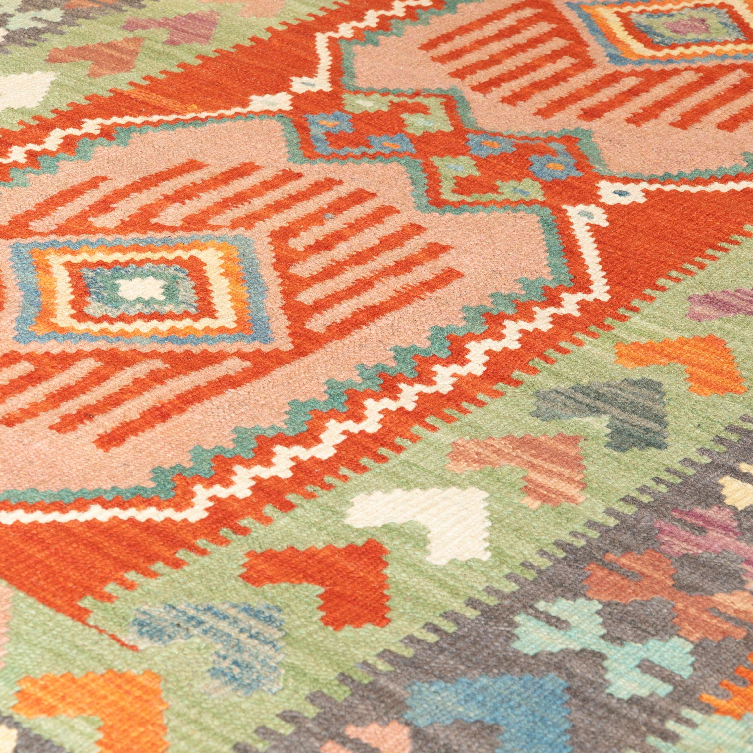 Experience the quality and tradition of Afghan craftsmanship with our lovely green and terracotta handmade Kilim. This flat weave kilim is woven with traditional vegetable-dyed wool, making it durable and perfect for use with underfloor heating. Its colourful and striking design is reversible, allowing it to be used as a floor covering, wall hanging, or throw. Upgrade your space with this beautiful and inexpensive piece.