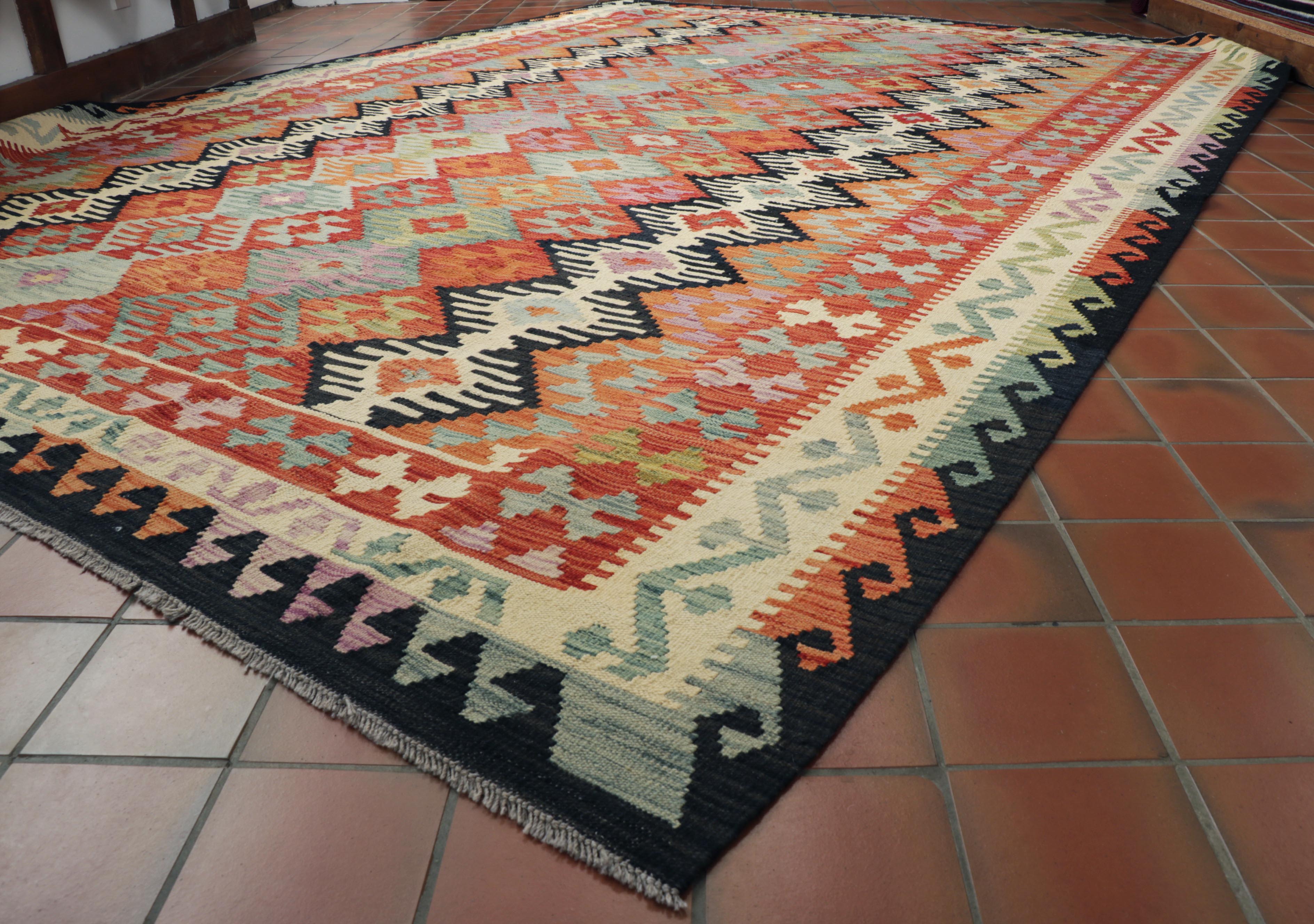 This handmade Afghan Kilim is handwoven from wool, featuring striking geometric patterns and vivid vegetable-dyed colours. It is a bold and beautiful statement piece, and the black colouring certainly makes it stand out. Its refined craftsmanship ensures lasting quality and durability.