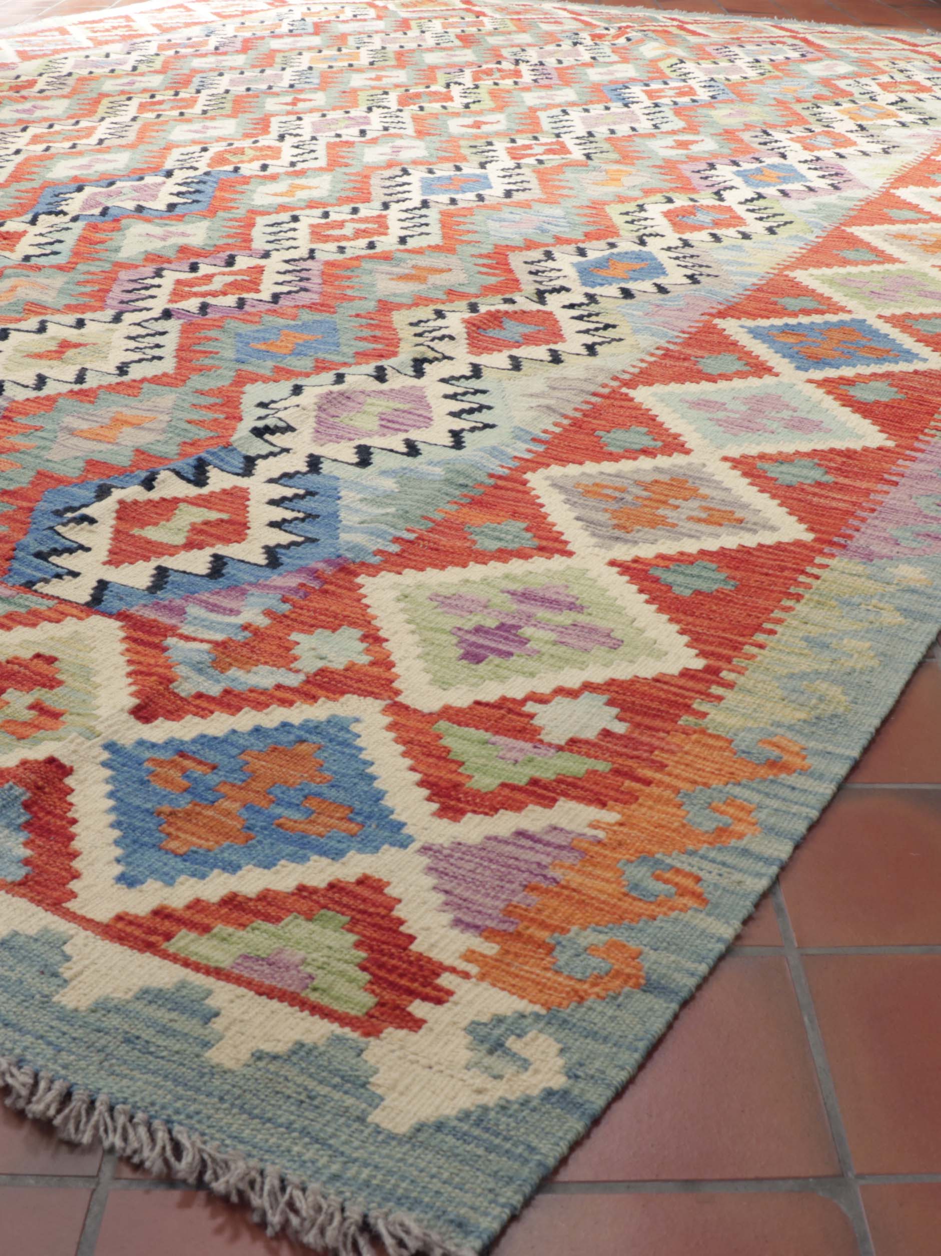 This exquisite Afghan Kilim is handcrafted with the finest vegetable-dyed wool. It boasts a hardwearing design that allows both sides to be utilised to their fullest potential. Its intricate composition features myriad multicoloured hues, artfully created using traditional vegetable- and mineral-based dyeing techniques. It offers excellent compatibility with underfloor heating.