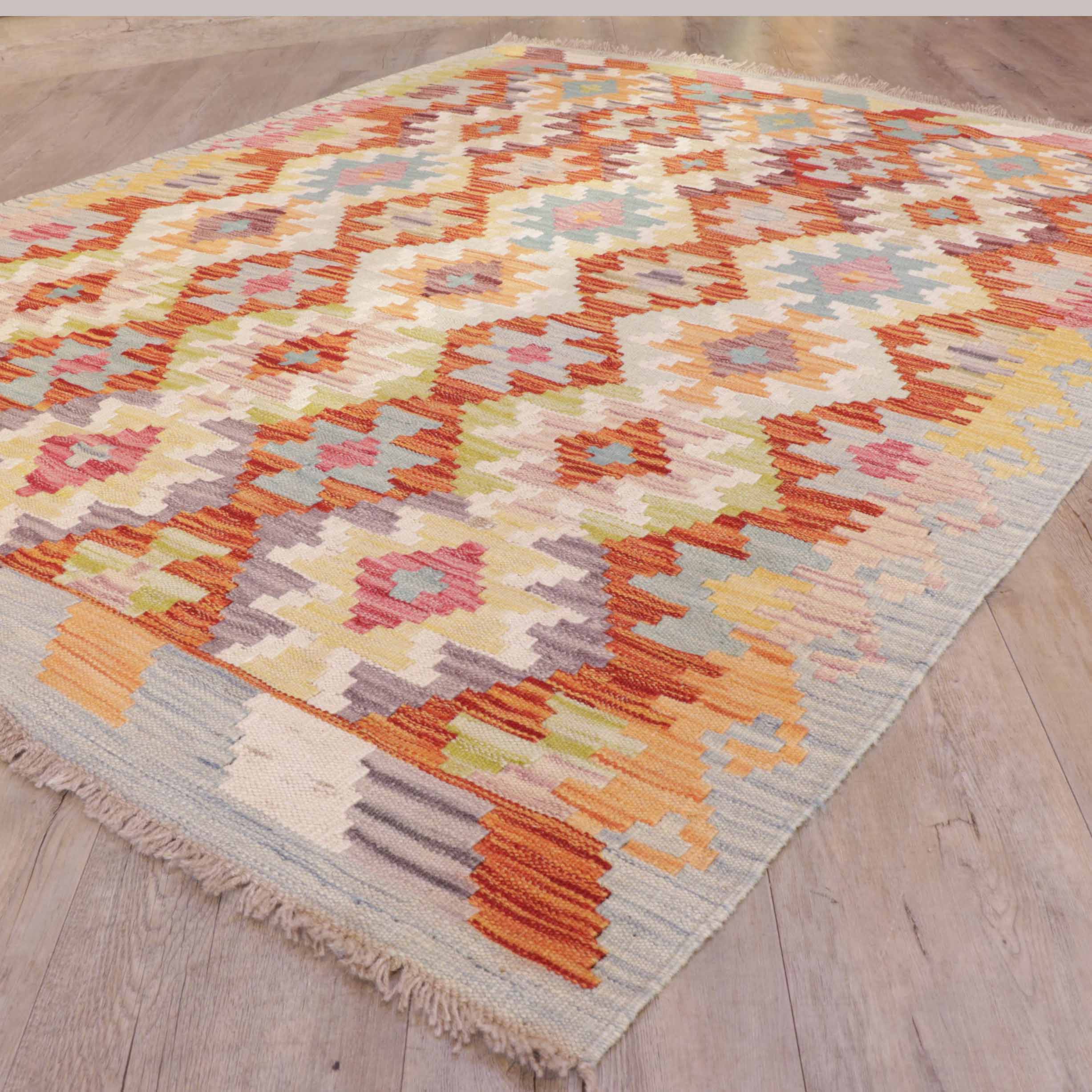 This handmade Afghan Kilim, expertly crafted by skilled artisan weavers in northwest Afghanistan, is a traditional masterpiece. Made from vegetable-dyed wool, it features vibrant colours and an intricate geometric design, adding a touch of culture and warmth to any space. It is perfect for the floor and can be used as a versatile wall hanging or throw. Affordable and reversible, this Kilim is a must-have for any home.