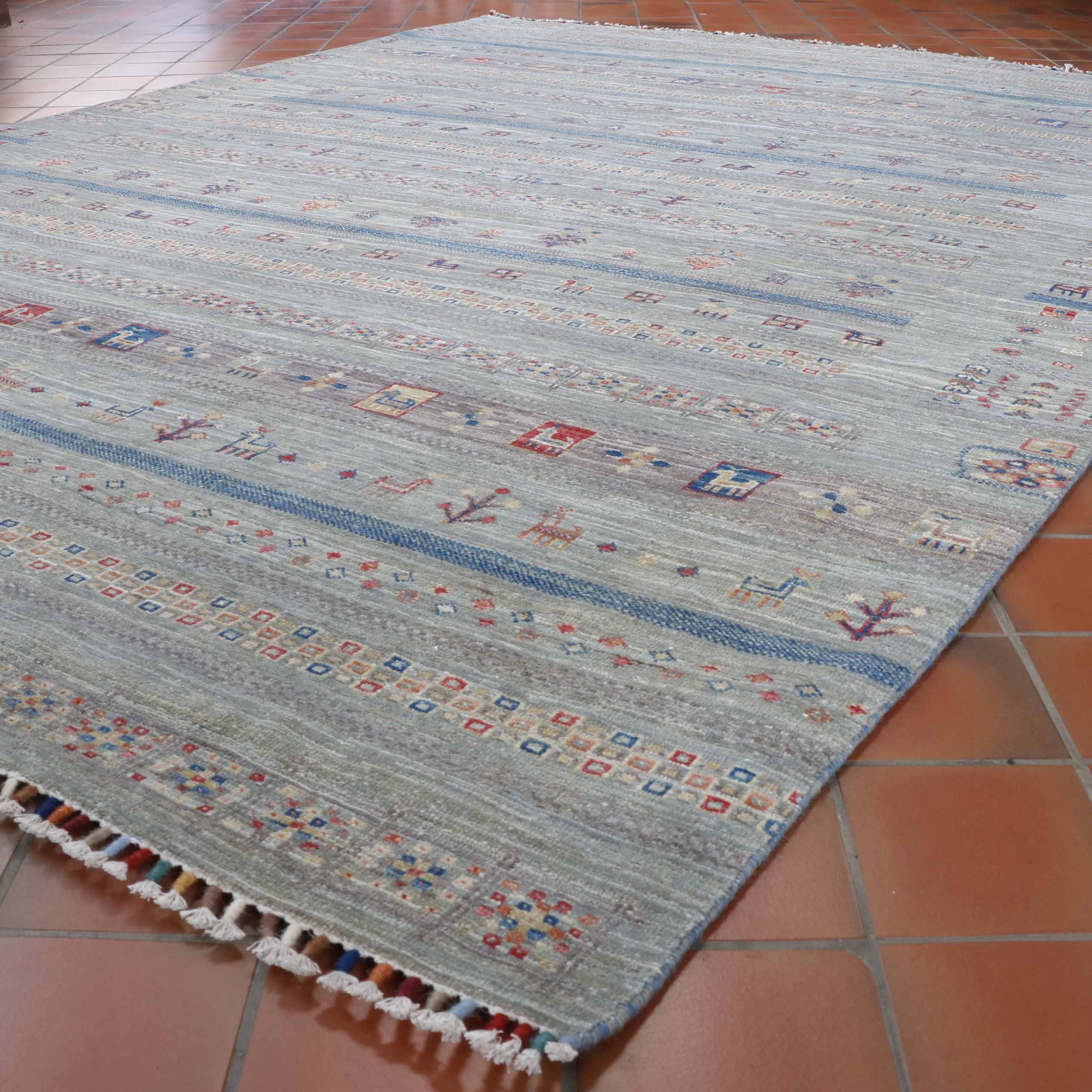 This gorgeous handmade Afghan Loribaft is a piece to behold! Its great colours – a perfect blend of blue, grey, and splashes of yellow and red—make this carpet a must-have for any contemporary decor. Whether you admire the beautiful animal motifs or bask in its soft embrace, you won't regret adding this one-of-a-kind Loribaft to your home!