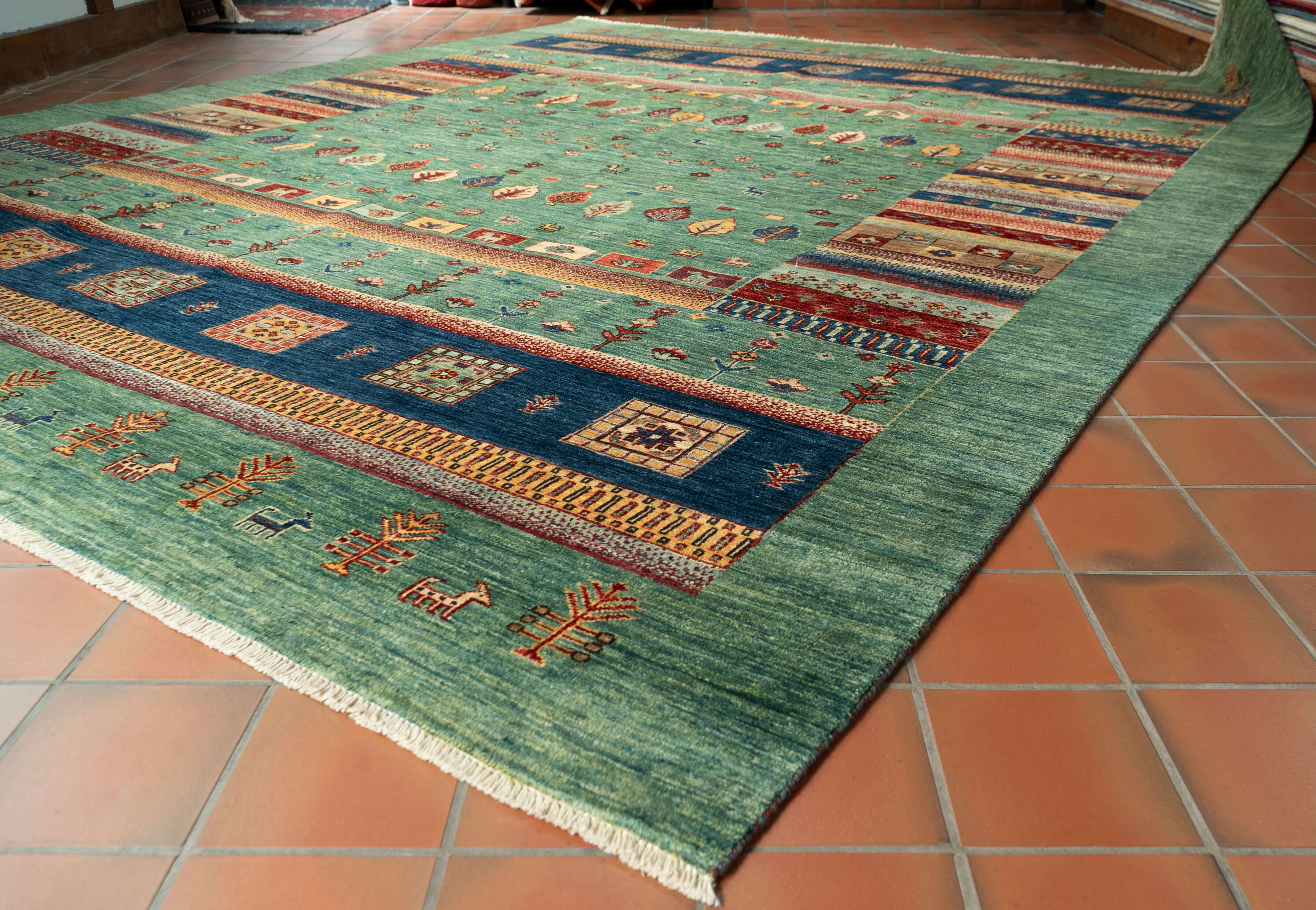 The carpets are still hand-knotted, and the wool is coloured with vegetable dye. The Loribaft rug designs can be reminiscent of Gabbeh designs, although the Loribaft pieces are more refined and tightly knotted. The colours of the Loribaft rugs and carpets are similar to those used in our Samarkand collections and possibly more vibrant. The main distinction is that the patterns are playful, using a defined colour palette and simple design, with stylised animals, plants, trees or characters with block colour often mimicking an ombre effect. Some Loribaft pieces do not have fringes, so they are finished with a plain kilim end or binding and secured to prevent fraying. Like the Samarkand carpets, other rugs are produced with an unusual bobbin wind on the warps.