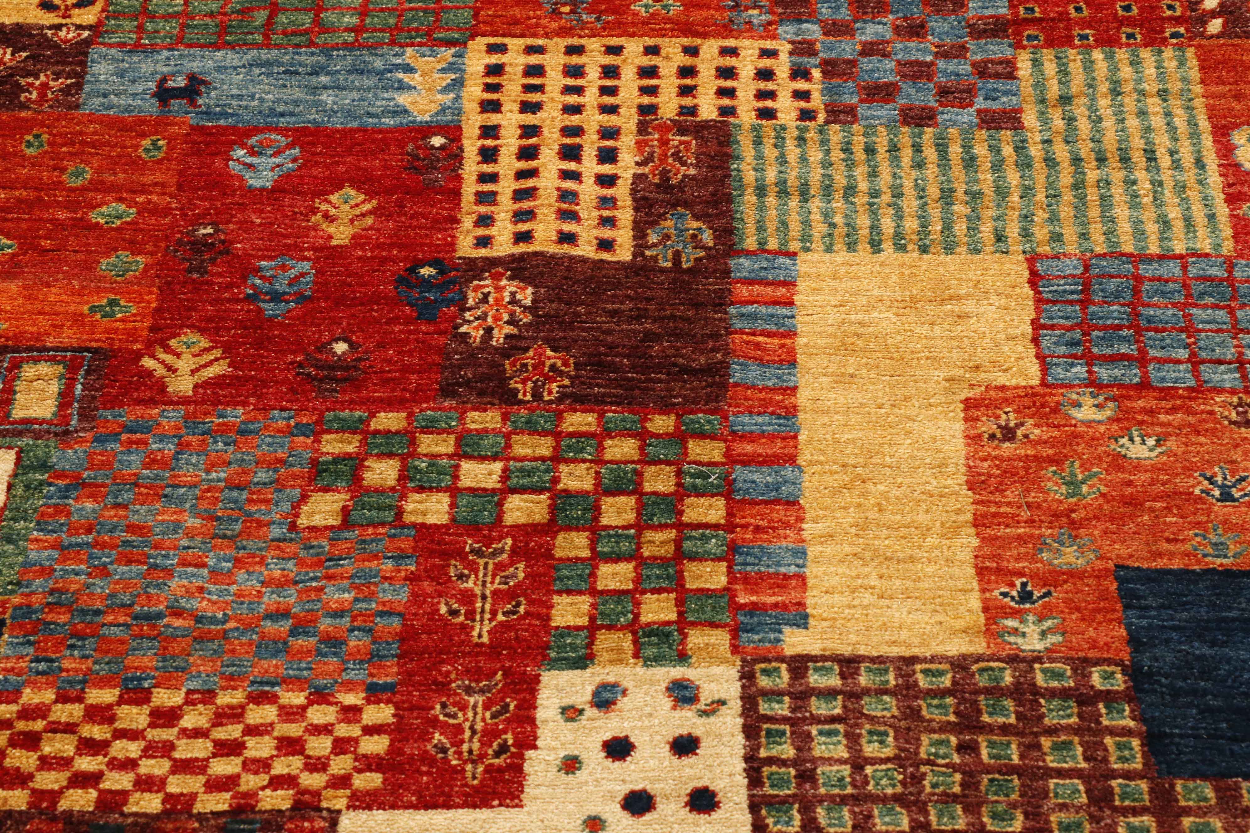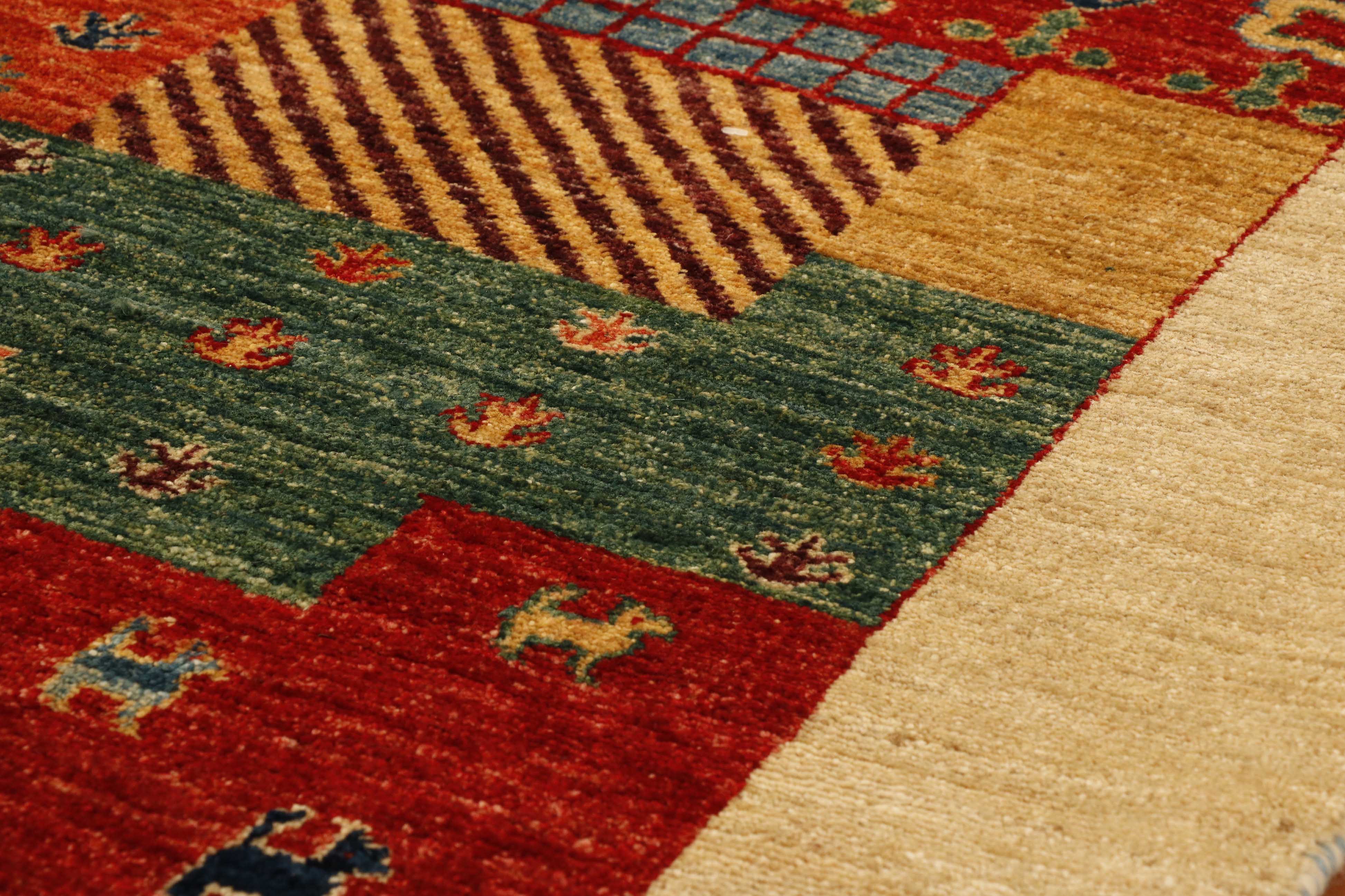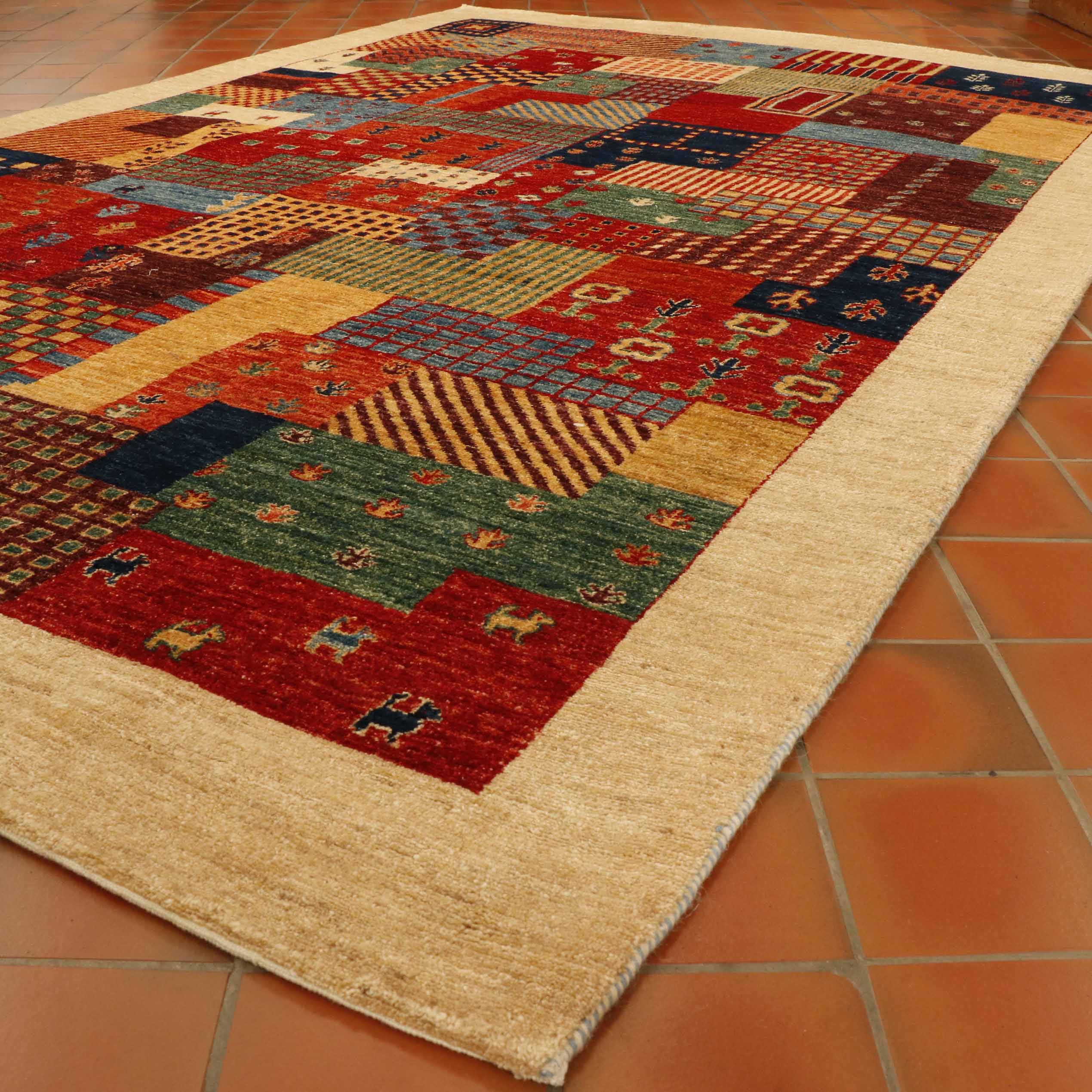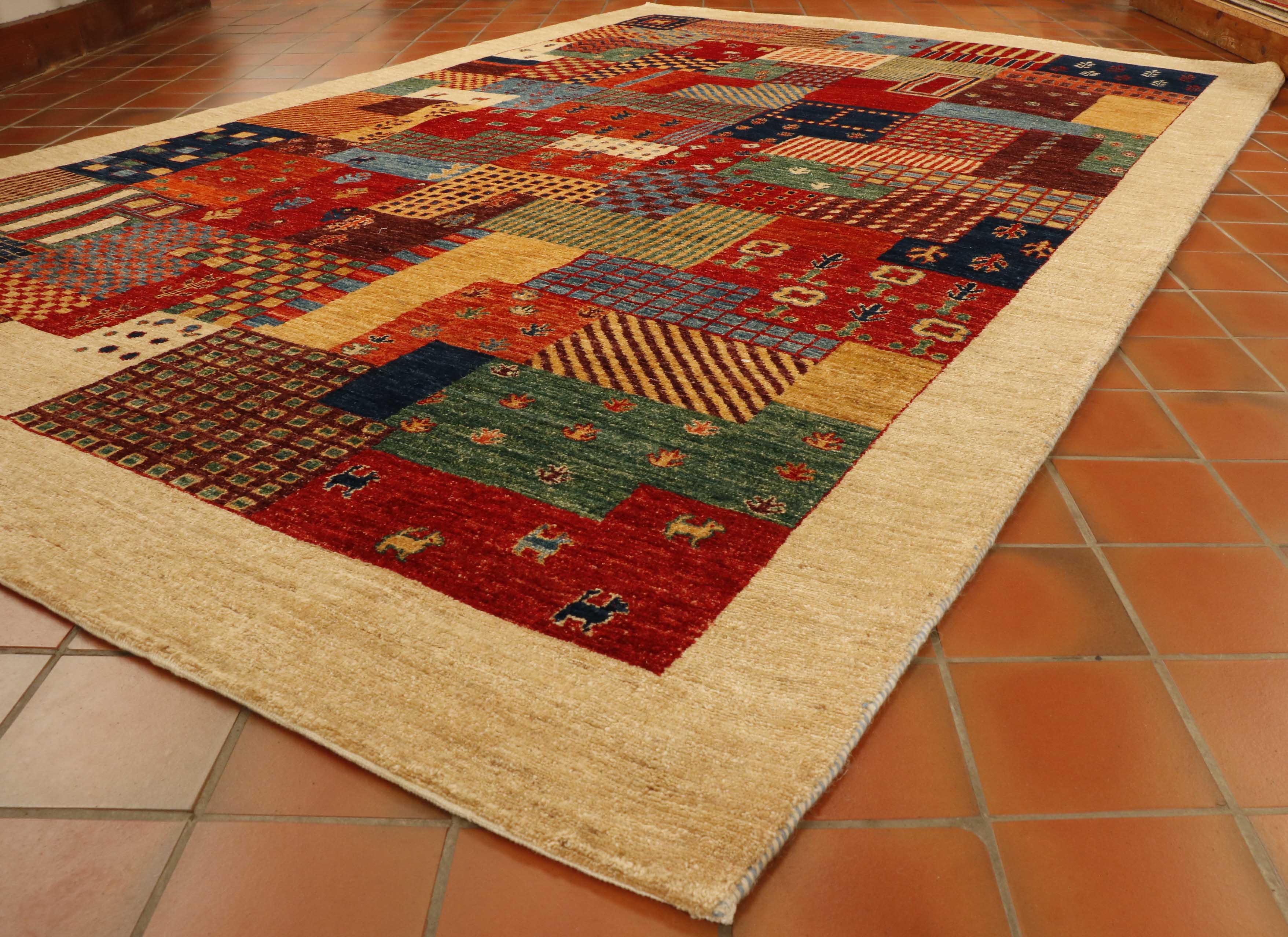 An unusual Afghan Loribaft carpet with bold blocks of contrasting colour makes for a traditionally made rug with a great modern twist. There is a real patchwork feel to the decorative style, the blocks of decorated colour being different shapes and sizes. The blocks of colour are a mix of orange, red, dark blue, green, yellow, blue, cream, burgundy and bright red. In addition, there is a wide cream/oatmeal border.