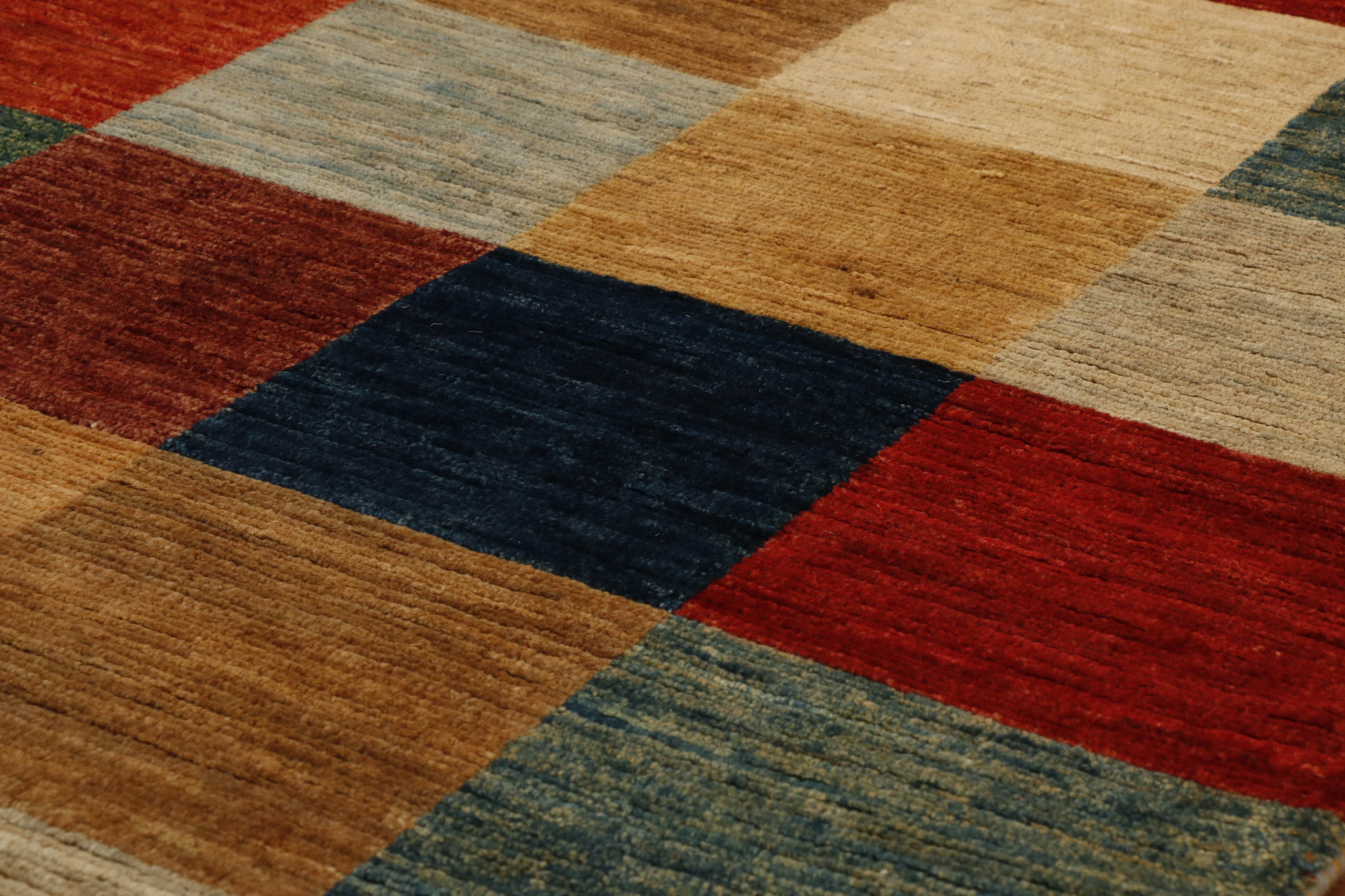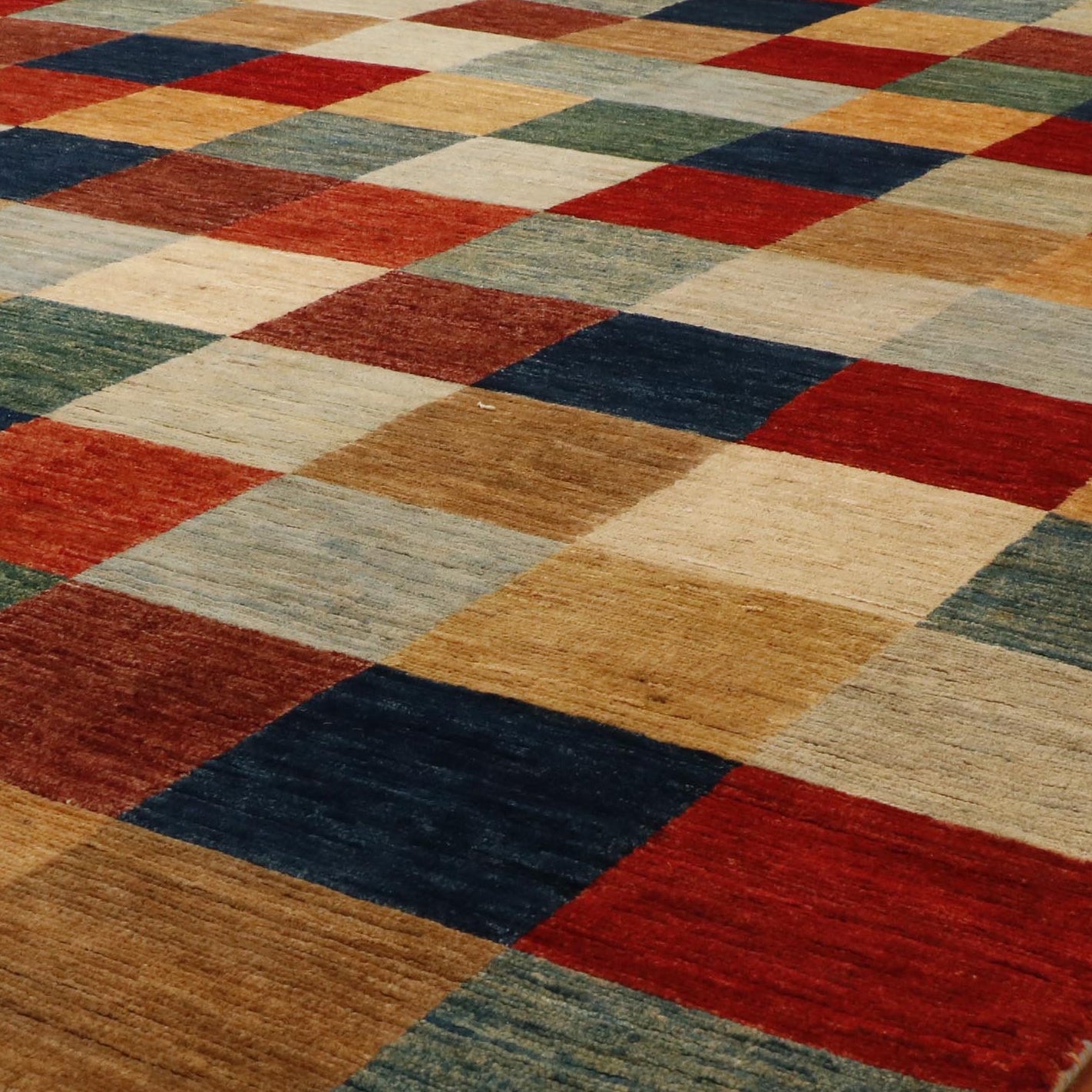 This striking contemporary Afghan Loribaft carpet is bright, cheery, and funky. The chequered effect with all the colours (a mix of reds, greens, browns, creams, and blues) works together beautifully to make a fabulous rug. With its all-over design and striking colours, this piece is an excellent choice for a living room with a coffee table.