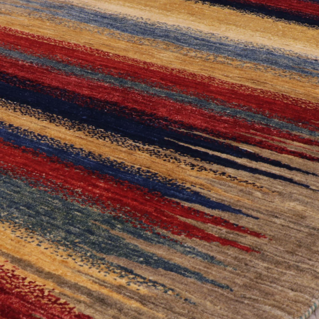 The carpets are still hand-knotted, and the wool is coloured with vegetable dye. The Loribaft rug designs can be reminiscent of Gabbeh designs, although the Loribaft pieces are more refined and tightly knotted. The colours of the Loribaft rugs and carpets are similar to those used in our Samarkand collections and possibly more vibrant. The main distinction is that the patterns are playful, using a defined colour palette and simple design, with stylised animals, plants, trees or characters with block colour often mimicking an ombre effect. Some Loribaft pieces do not have fringes, so they are finished with a plain kilim end or binding and secured to prevent fraying.