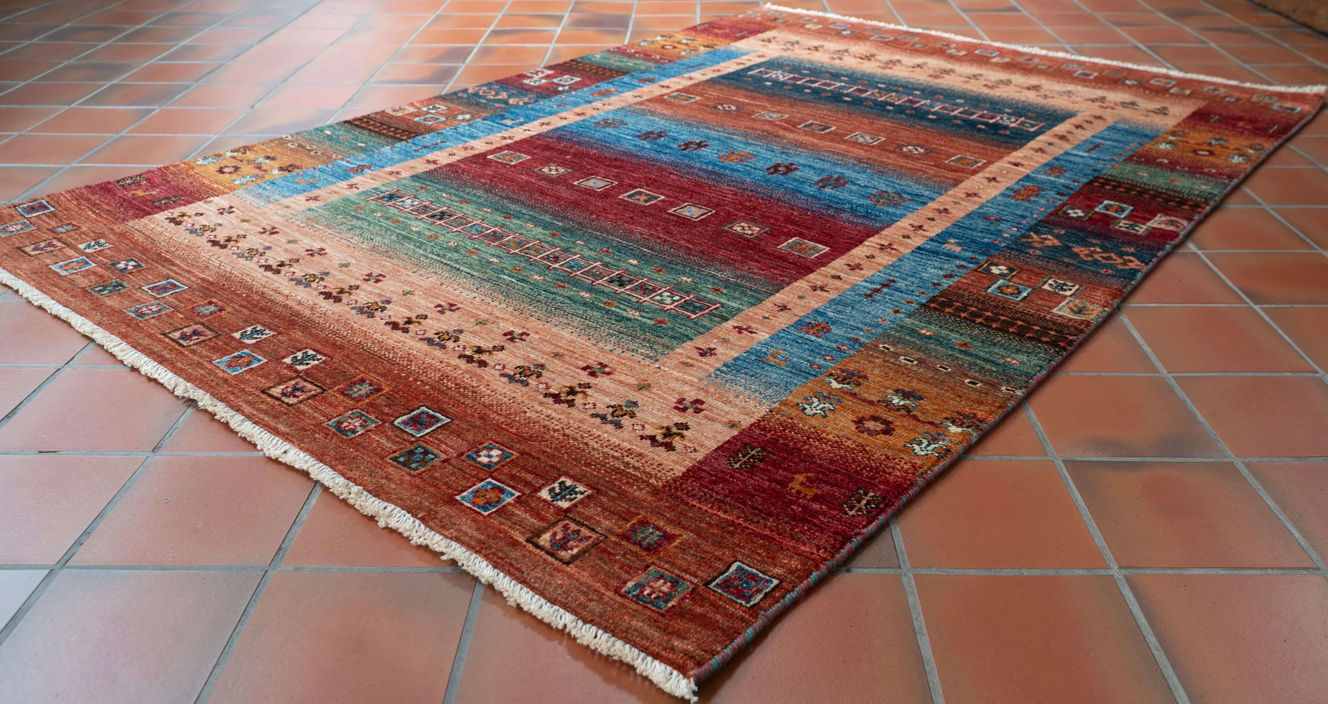 The carpets are still hand-knotted, and the wool is coloured with vegetable dye. The Loribaft rug designs can be reminiscent of Gabbeh designs, although the Loribaft pieces are more refined and tightly knotted. The colours of the Loribaft rugs and carpets are similar to those used in our Samarkand collections and possibly more vibrant. The main distinction is that the patterns are playful, using a defined colour palette and simple design, with stylised animals, plants, trees or characters with block colour often mimicking an ombre effect. Some Loribaft pieces do not have fringes, so they are finished with a plain kilim end or binding and secured to prevent fraying. Like the Samarkand carpets, other rugs are produced with an unusual bobbin wind on the warps.