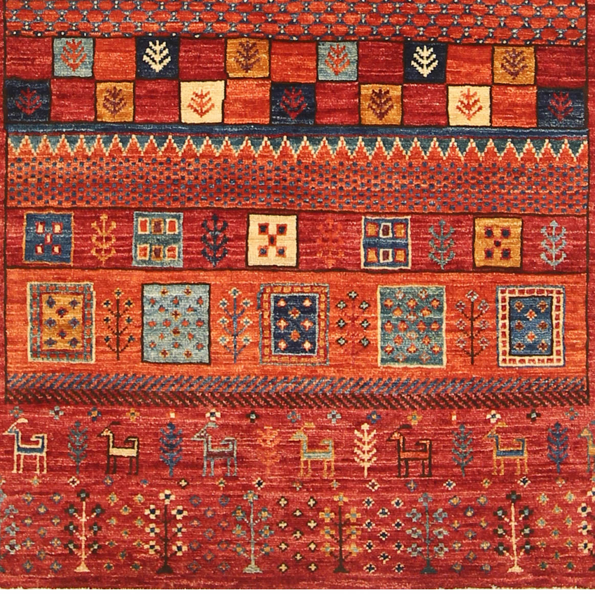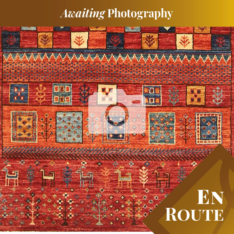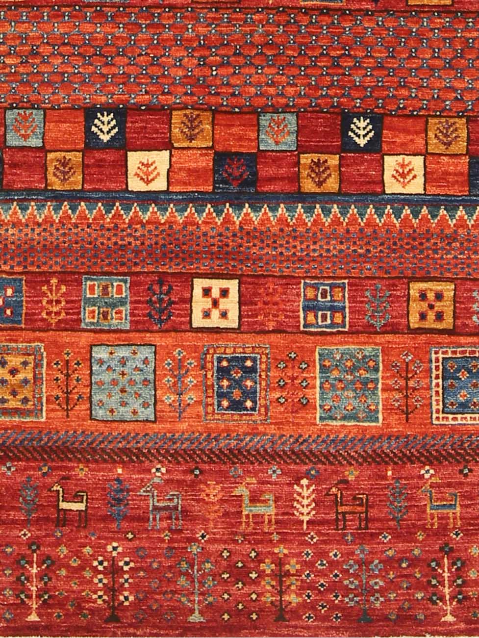 The carpets are still hand-knottedand the wool is coloured with vegetable dye. The Loribaft rug designs can be reminiscent of Gabbeh designs, although the Loribaft pieces are more refined and tightly knotted. The colours of the Loribaft rugs and carpets are similar to those used in our Samarkand collections and possibly more vibrant. The main distinction is that the patterns are playful, using a defined colour palette and simple design, with stylised animals, plants, trees or characters with block colour often mimicking an ombre effect. Some Loribaft pieces do not have fringes, so they are finished with a plain kilim end or binding and secured to prevent fraying.