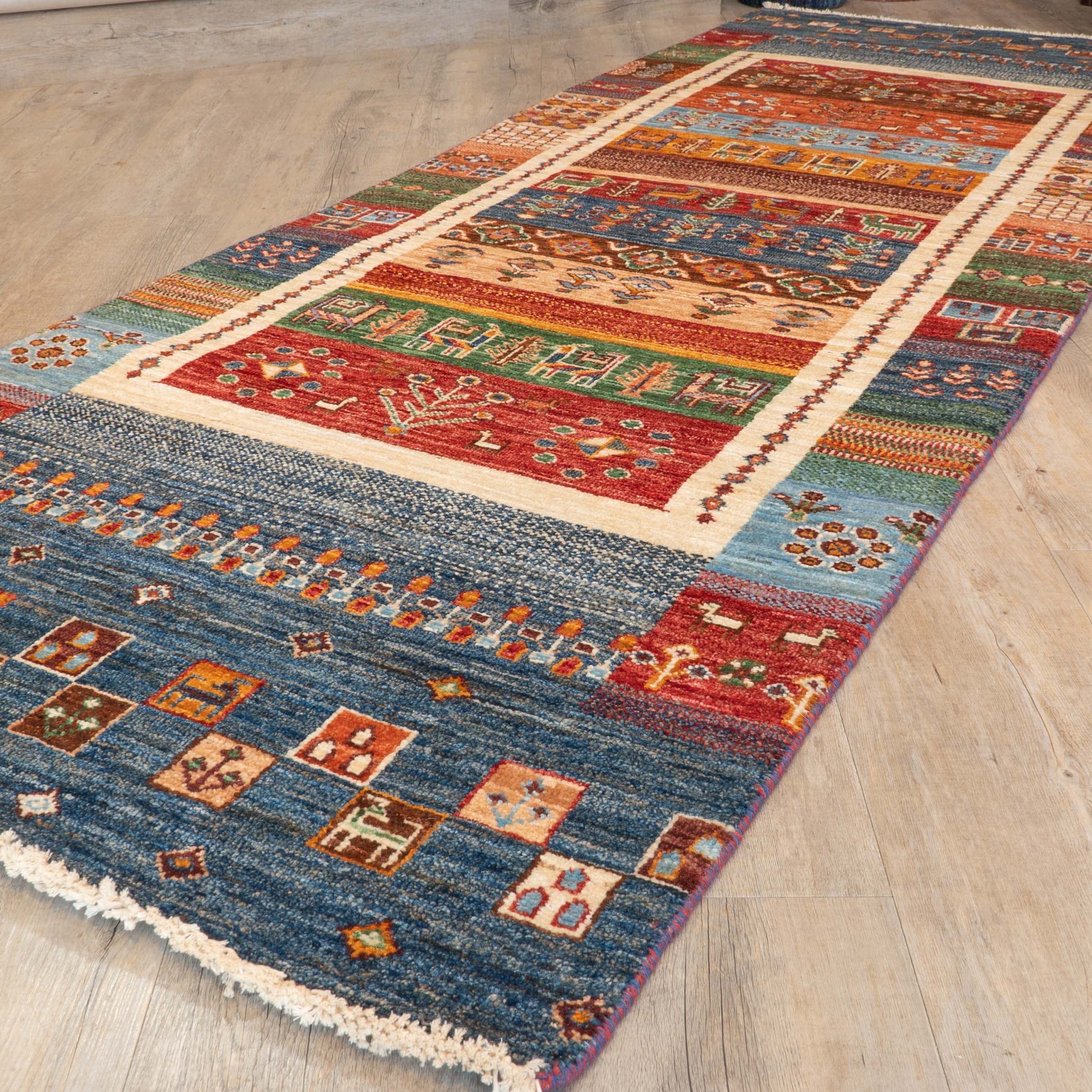 The carpets are still hand-knotted, and the wool is coloured with vegetable dye. The Loribaft rug designs can be reminiscent of Gabbeh designs, although the Loribaft pieces are more refined and tightly knotted. The colours of the Loribaft rugs and carpets are similar to those in our Samarkand collections, though possibly more vibrant. The main distinction is that the patterns are playful, using a defined colour palette and simple design, with stylised animals, plants, trees, or characters rendered in block colour that often mimics an ombre effect. Some Loribaft pieces do not have fringes, so they are finished with a plain kilim end or binding and secured to prevent fraying. Like the Samarkand carpets, other rugs are produced with an unusual bobbin wind on the warps.