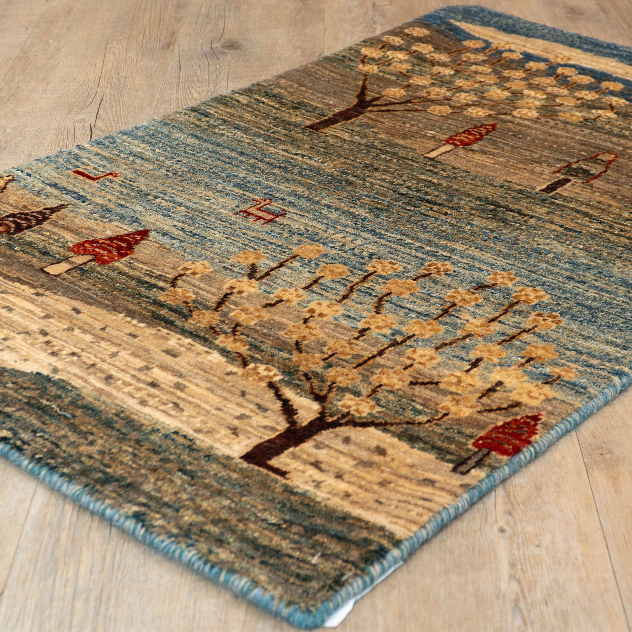 Expertly crafted by skilled artisan weavers in northwest Afghanistan, this Handmade Afghan Luri Gabbeh rug is a testament to traditional craftsmanship. It is made with vegetable-dyed handspun wool and has a contemporary style and a unique landscape design with various trees. Soft oatmeal and blue tones, along with darker brown and brick red accents, make this rug practical and durable.