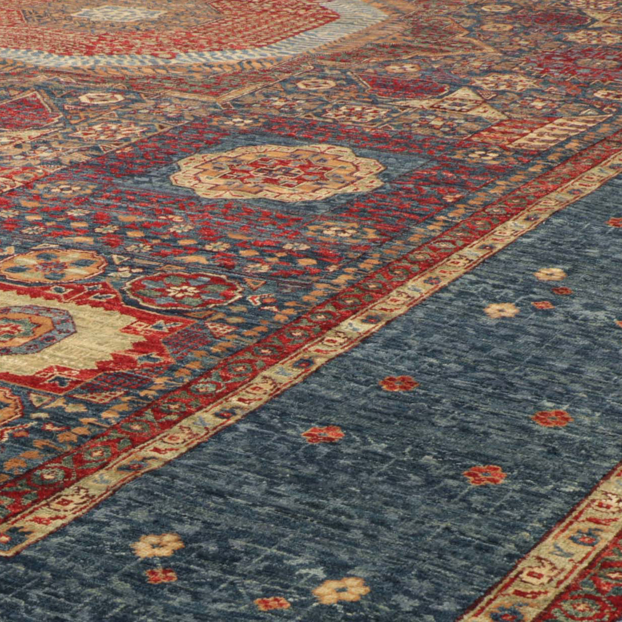This luxurious, handmade Afghan Mamluk carpet showcases exquisite craftsmanship with traditional Egyptian design. It was hand-knotted by expert Afghan weavers using fine hand-spun wool, vegetable dyes, and a short-pile yarn to create a high-quality, durable product. The vibrant mid-blue ground contrasts beautifully with the complex red-and-terracotta pattern, creating an eye-catching, large-scale carpet.