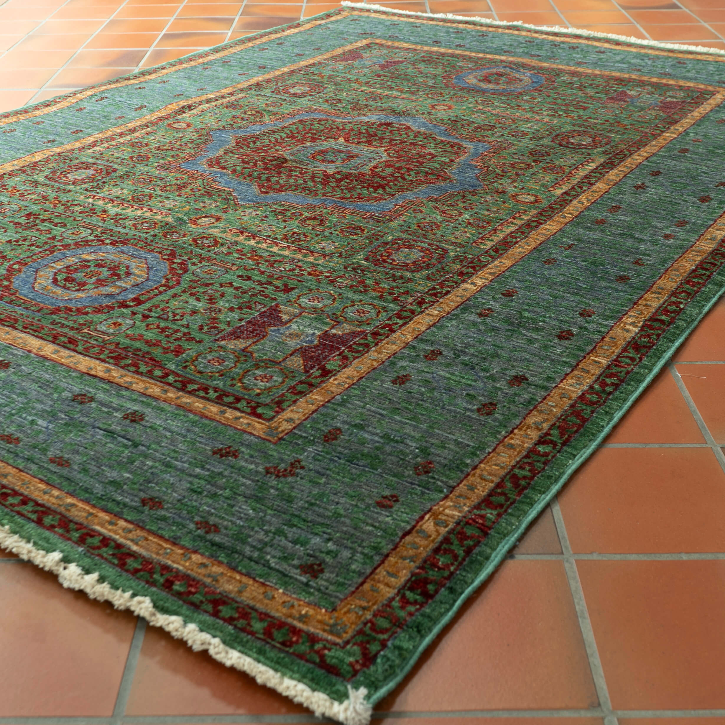 Introducing our exquisite handmade Afghan Mamluk rug. This fine-quality piece is handcrafted by skilled artisans in northwest Afghanistan, using traditional techniques and vegetable-dyed handspun wool. Its striking design and unusual colour palette, featuring a strong green background, teal border, and touches of ruby red, make it a practical and hardwearing addition to any space. The beautiful lustre of the pile adds a touch of elegance, making it a must-have for those with a taste for the exclusive.