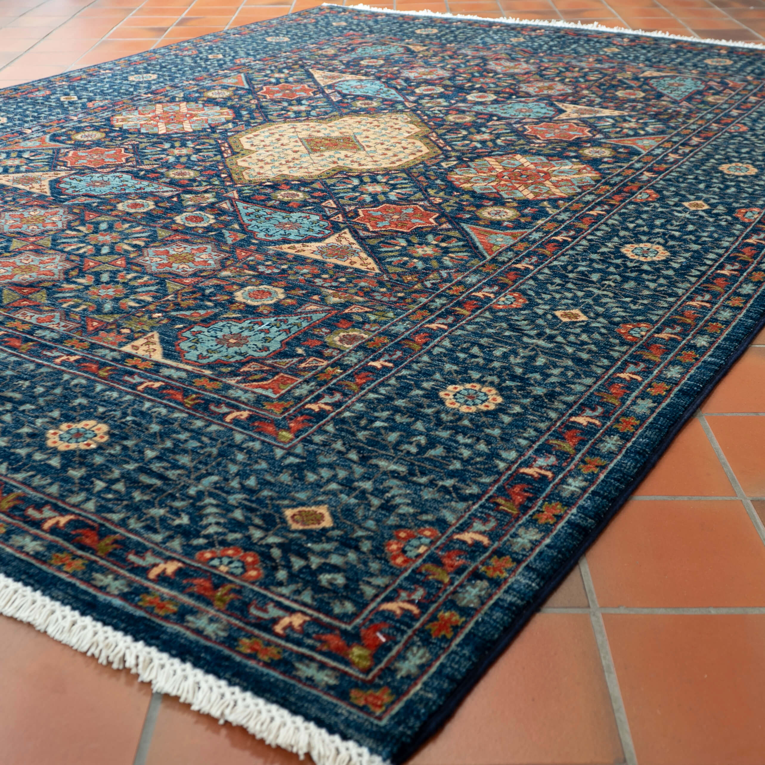 The history of these ancient Egyptian carpet designs could be traced to the 'Mamluk Dynasty around 1250; these Turkic descendants established a thriving carpet industry in Cairo in the 15th century. In recent years, many Afghan weavers have been interested in old designs like Mamluk, which they interpret, paying particular attention to the new colours that would not have been traditionally used. As you may expect, these pieces are handmade, often using traditional vegetables dyed on cotton foundations. The final finishing process, such as surface clipping and herbal washing, is generally undertaken in Pakistan. The Afghan Mamluk carpets at Jennings Rugs are amongst the most prized pieces, with a level of detail that often surpasses Oriental carpet rugs produced elsewhere. The fine weave and beautiful wool make these pieces very desirable.