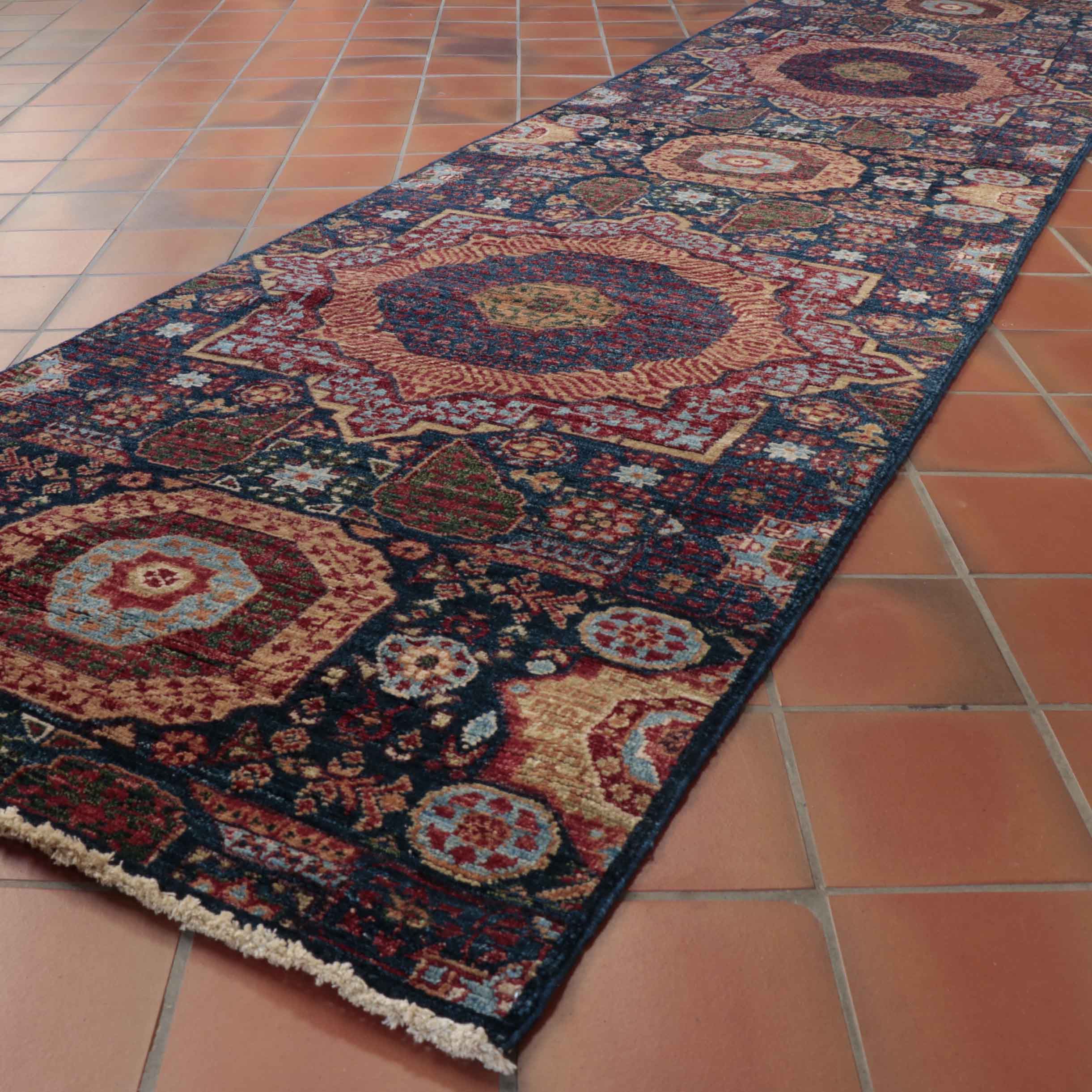 This handmade Afghan Mamluk runner is a sophisticated and hard-wearing addition to any home. Expertly crafted by experienced artisans, this piece features a geometric pattern and blue background, making it an interesting and practical choice. Make an elegant statement with this luxurious and durable piece. This traditional Afghan Mamluk runner is crafted from fine Afghan wool, resulting in a durable, stylish product. With a carefully designed pattern and vibrant colours, this runner adds sophistication and interest to any interior space.