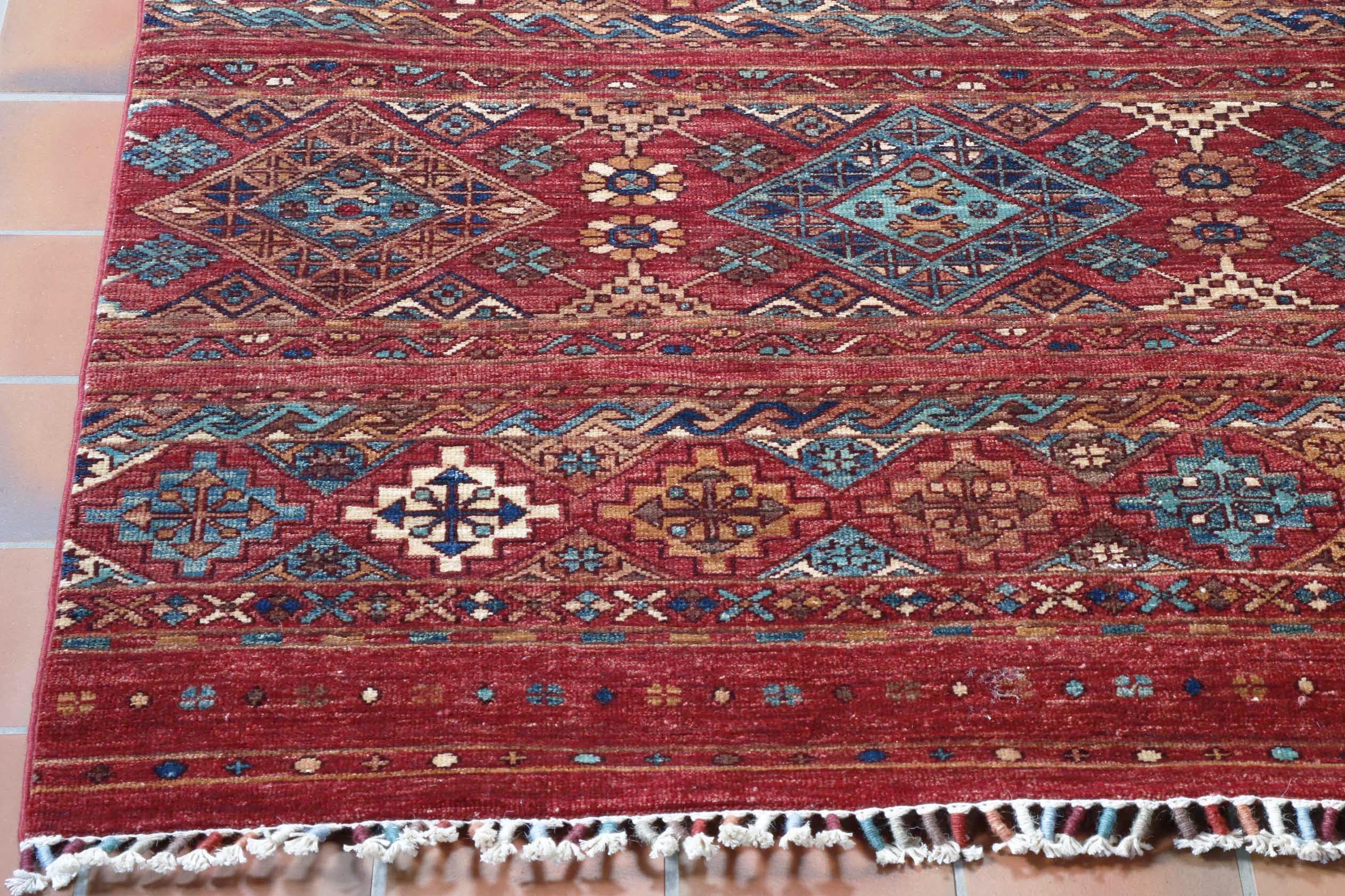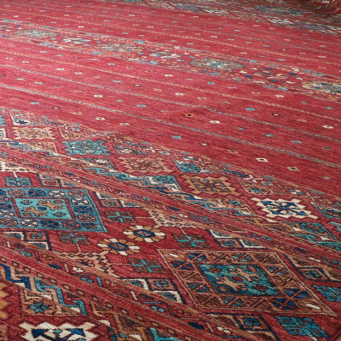 Hand-knotted Afghan Samarkand rugs and carpets are a relatively new production for us. We are always looking for something different or unusual that ticks that box. With wonderful colours and a mixture of traditional and modern designs, these rugs make a striking statement. Samarkand rugs have been produced recently in northwest Afghanistan, and the name refers to their distinctive design. Samarkand, in Uzbekistan, is famous, along with Bukharafor its role on the Silk Road, which linked China with the West. We hope you also like this interesting, colourful carpet as much as we do.