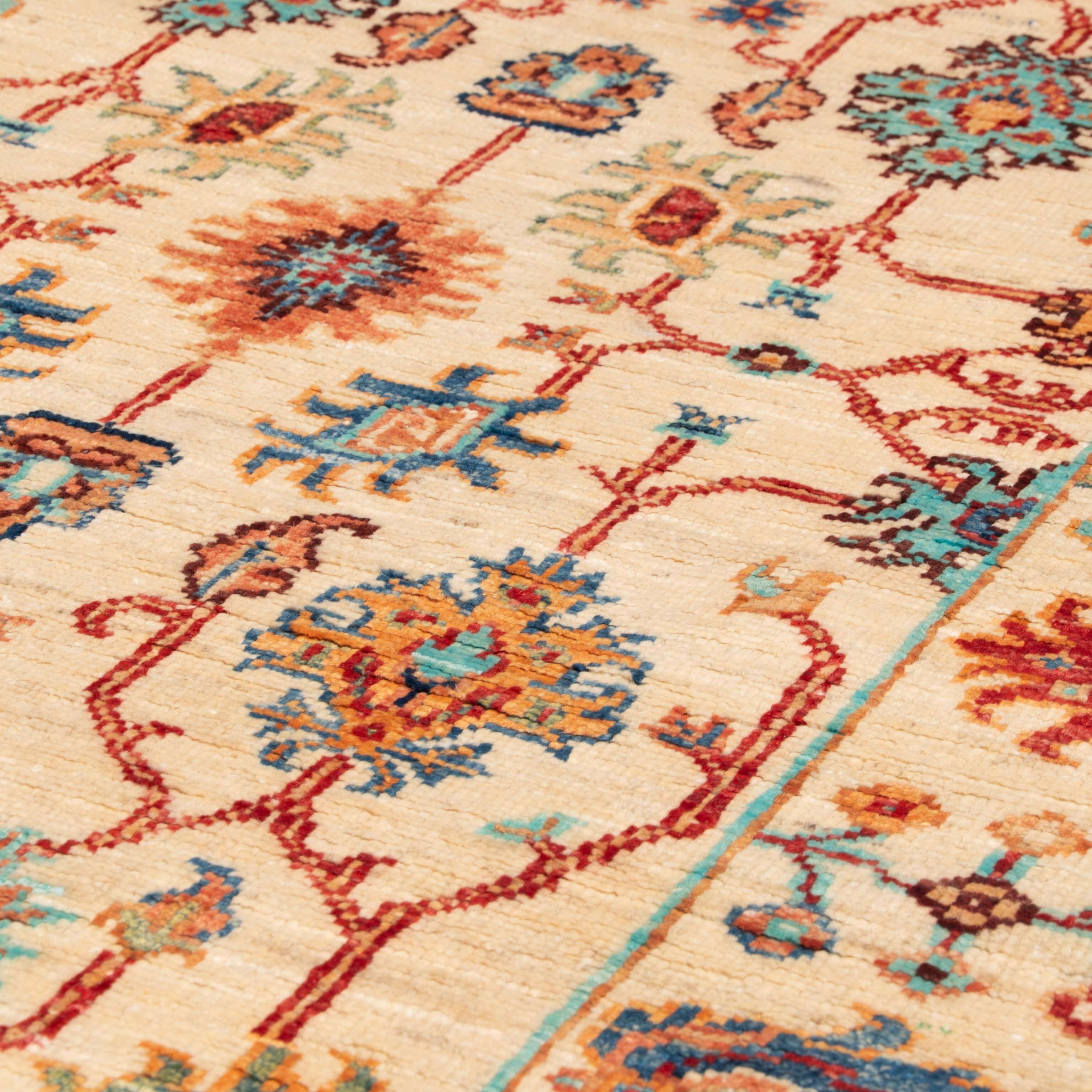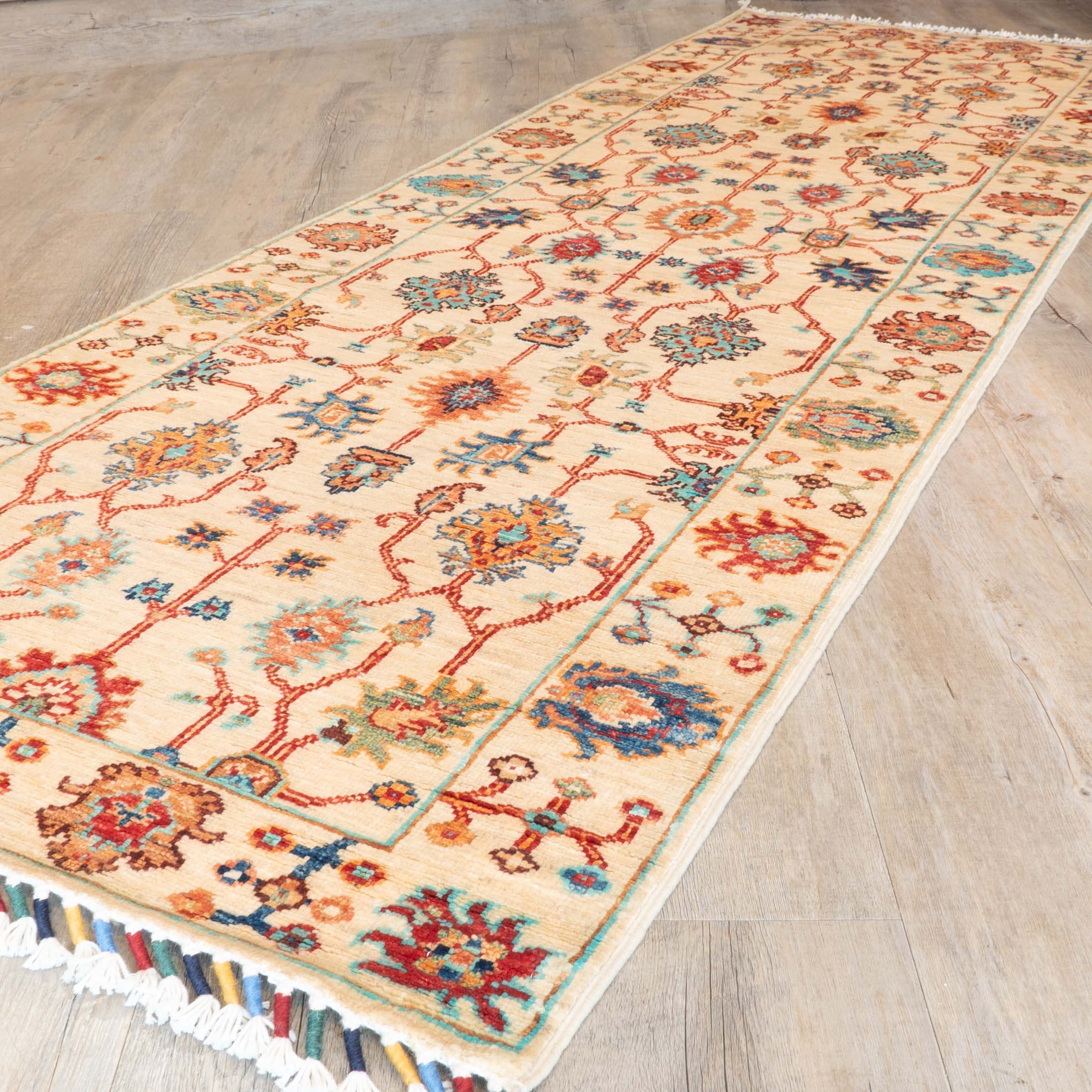 Originating from northwest Afghanistan, this pretty Sultani short runner presents a classic all-over floral motif in refined shades that embody timeless sophistication. Meticulously crafted from vegetable-dyed, handspun wool, balances robust durability with a soft, lustrous texture that elevates any interior setting. Each piece is a testament to the expert craftsmanship and artistic heritage passed through generations of skilled weavers, making it both a functional home accessory and a valuable cultural artefact. This premium-quality piece delivers lasting elegance and resilience, ideal for connoisseurs of genuine, handcrafted luxury.
