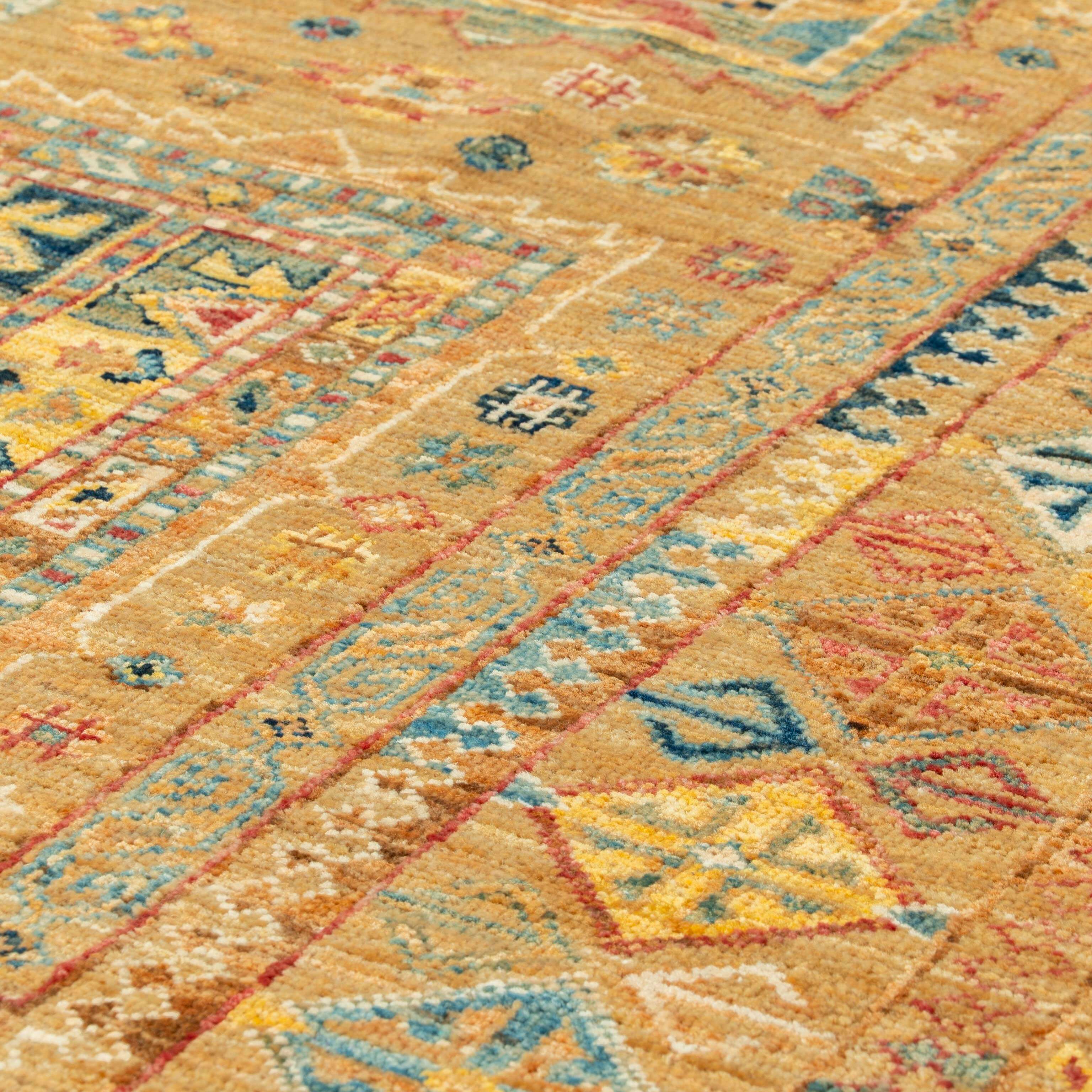 This exquisite handmade fine Afghan Tribal rug embodies centuries of craftsmanship from northwest Afghanistan's cottage industry. Artisans using traditional skills passed through generations have created this durable piece from vegetable-dyed handspun wool. The unusual geometric pattern features soft gold tones complemented by subtle green accents. Its gentle colour palette and exceptional durability make it both a practical investment and an authentic cultural artefact.