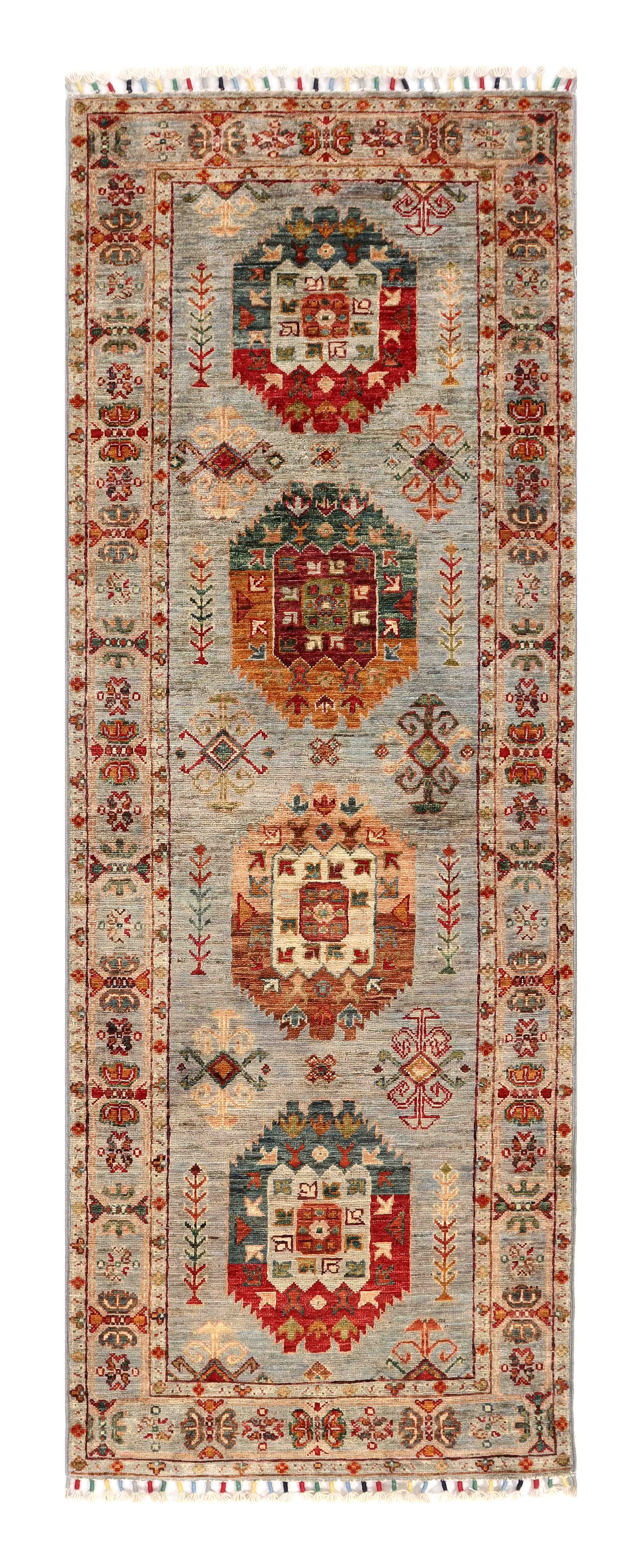 Although these tribal carpets and rugs are hand-knotted in Afghanistan using age-old methods, such as hand-spinning wool, which has been vegetable-dyed, the basis of this design originates from the Caucasus. The short pile emphasises the sharpness of the design. Each piece will be made from Afghan wool, often spun in Ghazni. The Afghan wool is generally slightly coarser and more curly than other wools and is excellent for carpet weaving. Afghan Tribal carpets are usually made using bold geometric designs in strong, vibrant colours, with rich reds and warm terracotta, differing shades of blues with soft golds and creams.