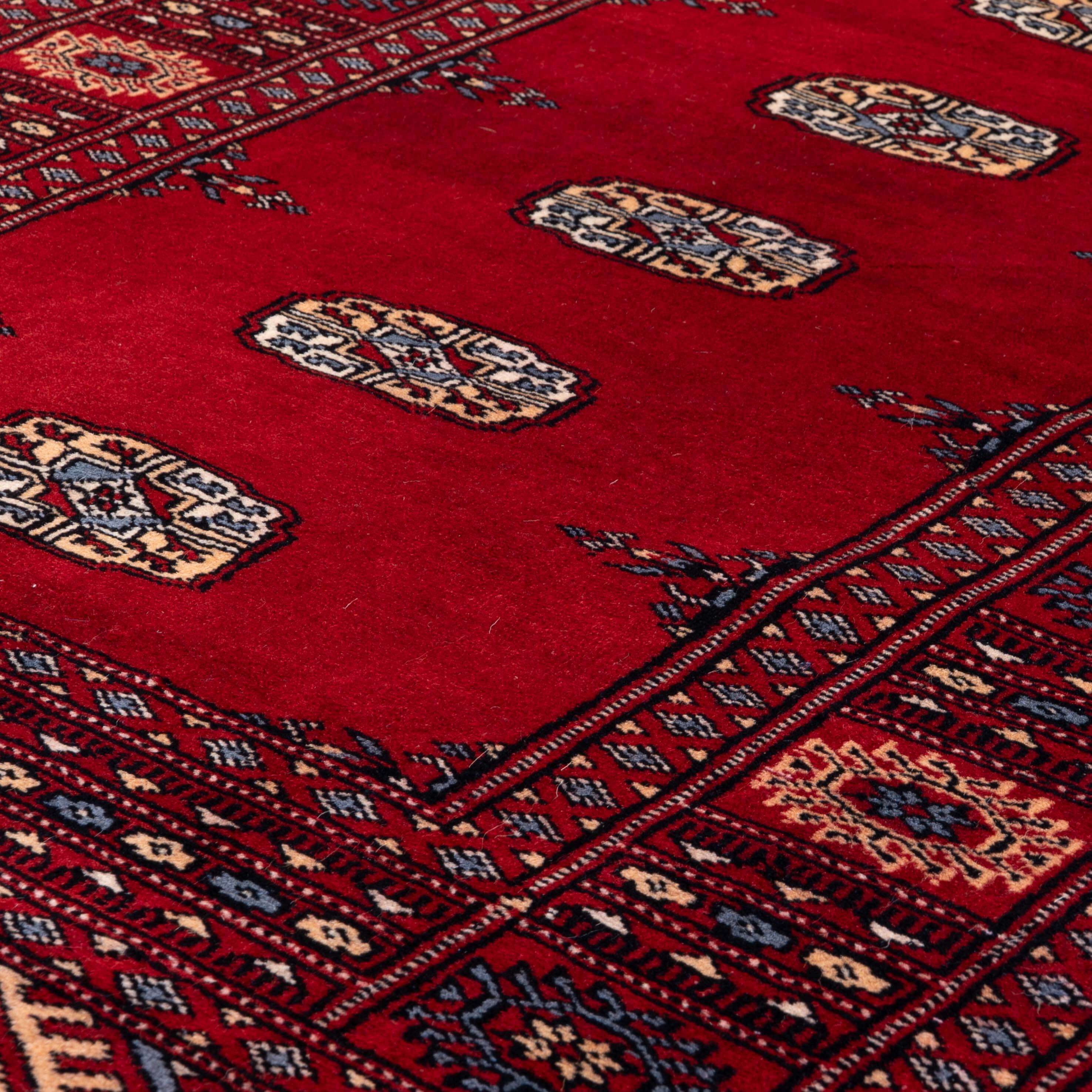Crafted by skilled weavers in the villages surrounding Lahore, this authentic Pakistan Bokhara rug exemplifies traditional craftsmanship. The wool pile is meticulously hand-knotted onto a sturdy cotton foundation, creating a luxuriously soft, silky surface that invites barefoot comfort. Its rich red hue and intricate traditional design bring timeless elegance to any interior space. This exceptional piece offers the hallmark quality and durability of genuine handmade rugs at a remarkable value, making it an investment in both beauty and longevity.Please click the hyperlinks below if you are interested in additional information.This Pakistan Bokhara rug is finely knotted in a traditional design...