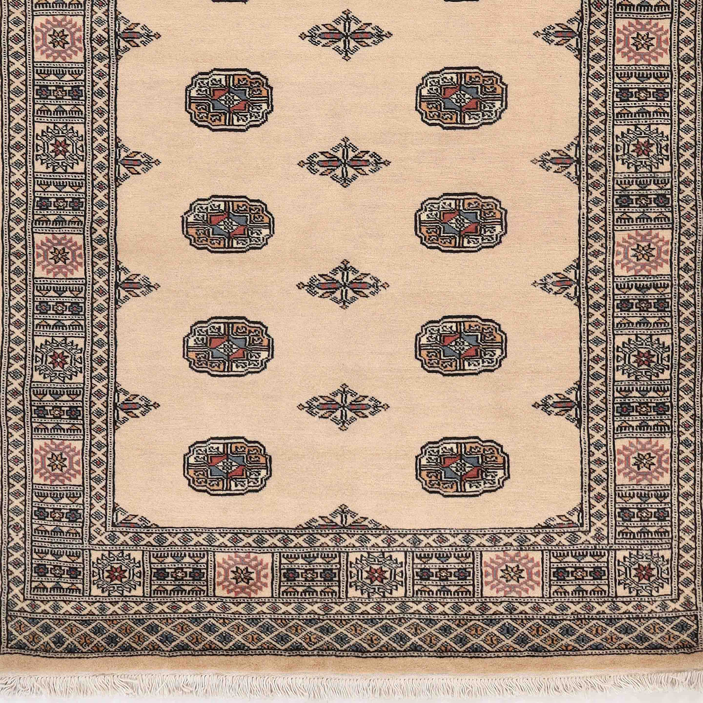 The well-known Bokhara design originates from Uzbekistan, where the nomadic Turkoman tribespeople first took their rugs to be sold. The repetitive octagonal motif, known as a "gul" (Persian for "rose"), is a characteristic feature of Bokhara rugs. Today, Pakistani people weave this design in a wide range of colours and sizes.