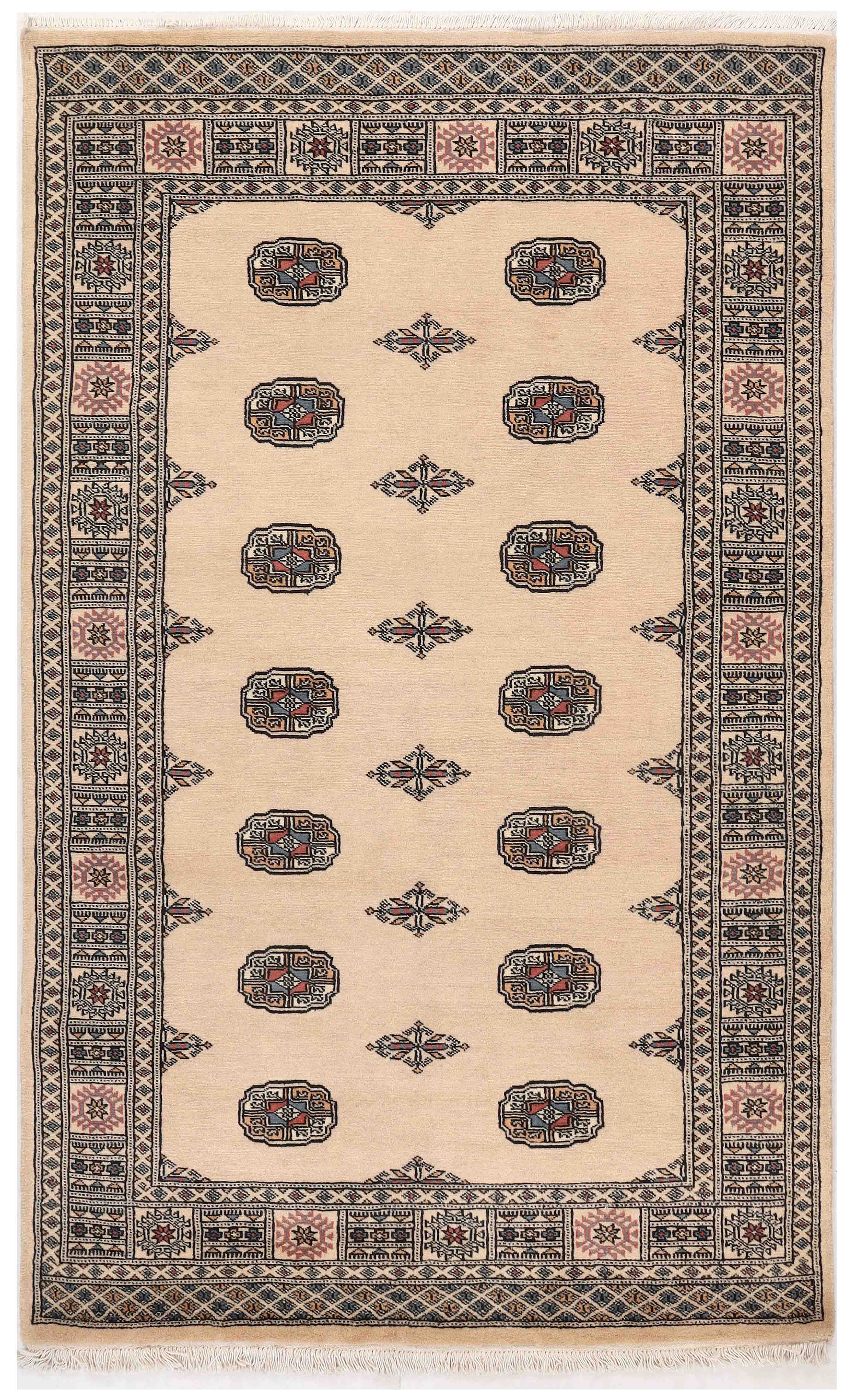 This Pakistan Bokhara rug is finely knotted in a traditional design using lovely, luxurious, soft, silky wool. The Bokhara rugs are always made with a wool pile, but unfortunately, some people try to pass them off as silk. Handmade Bokhara rugs offer excellent value.