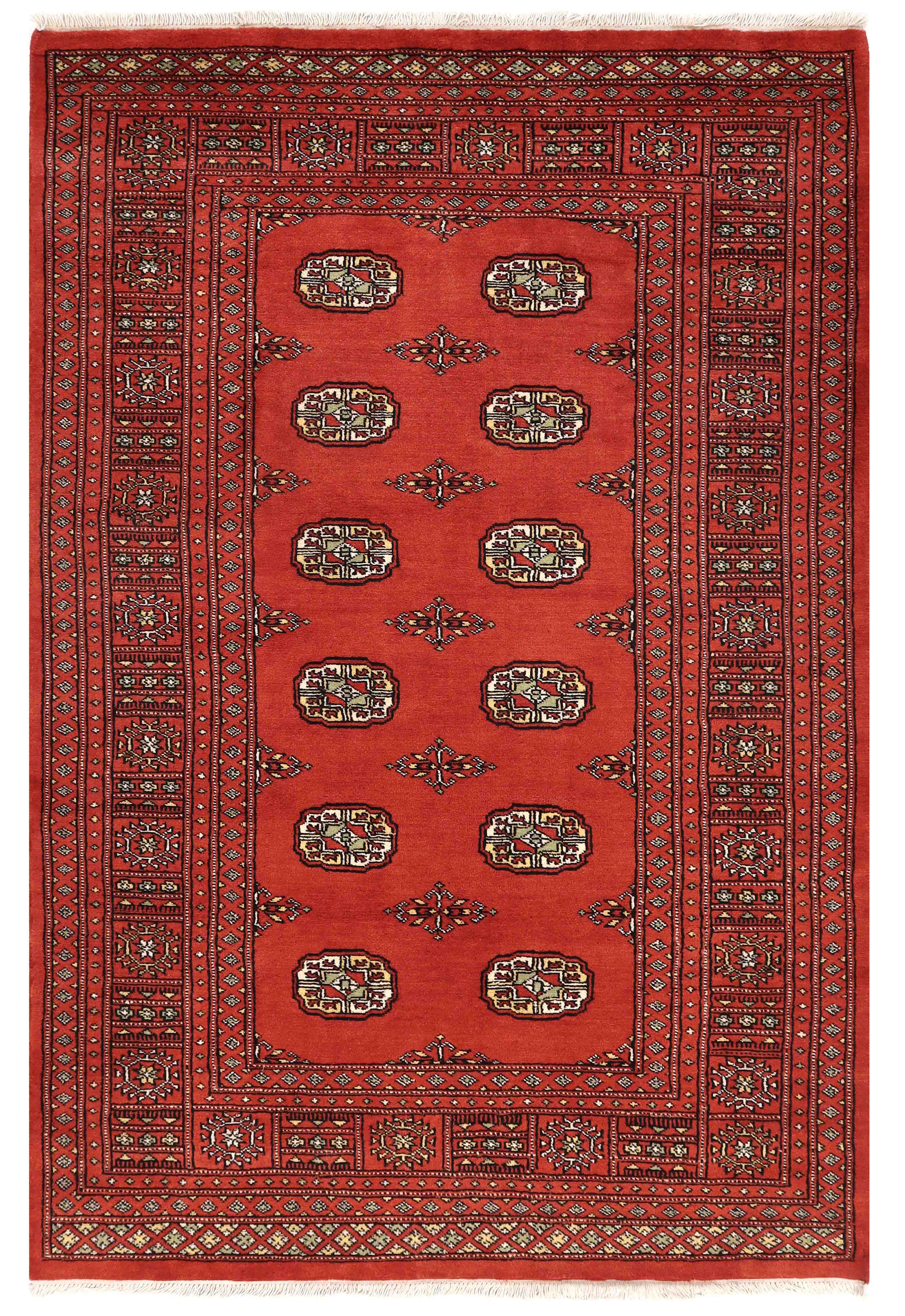 The well-known Bokhara design originates from Uzbekistan, where the nomadic Turkoman tribespeople first took their rugs to be sold. The repetitive octagonal motif, known as a "gul" (Persian for "rose"), is a characteristic feature of Bokhara rugs. Today, Pakistani people weave this design in a wide range of colours and sizes.