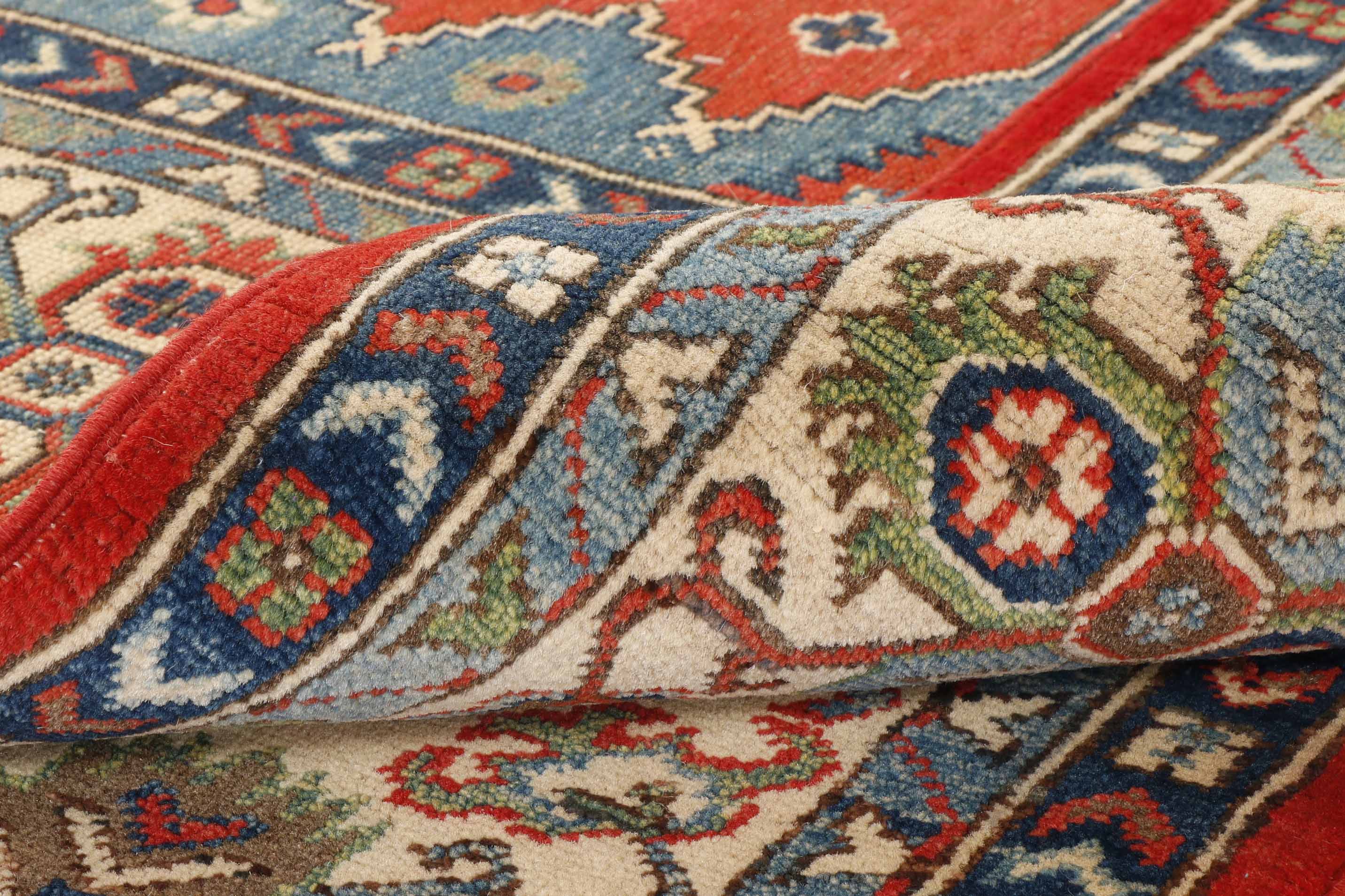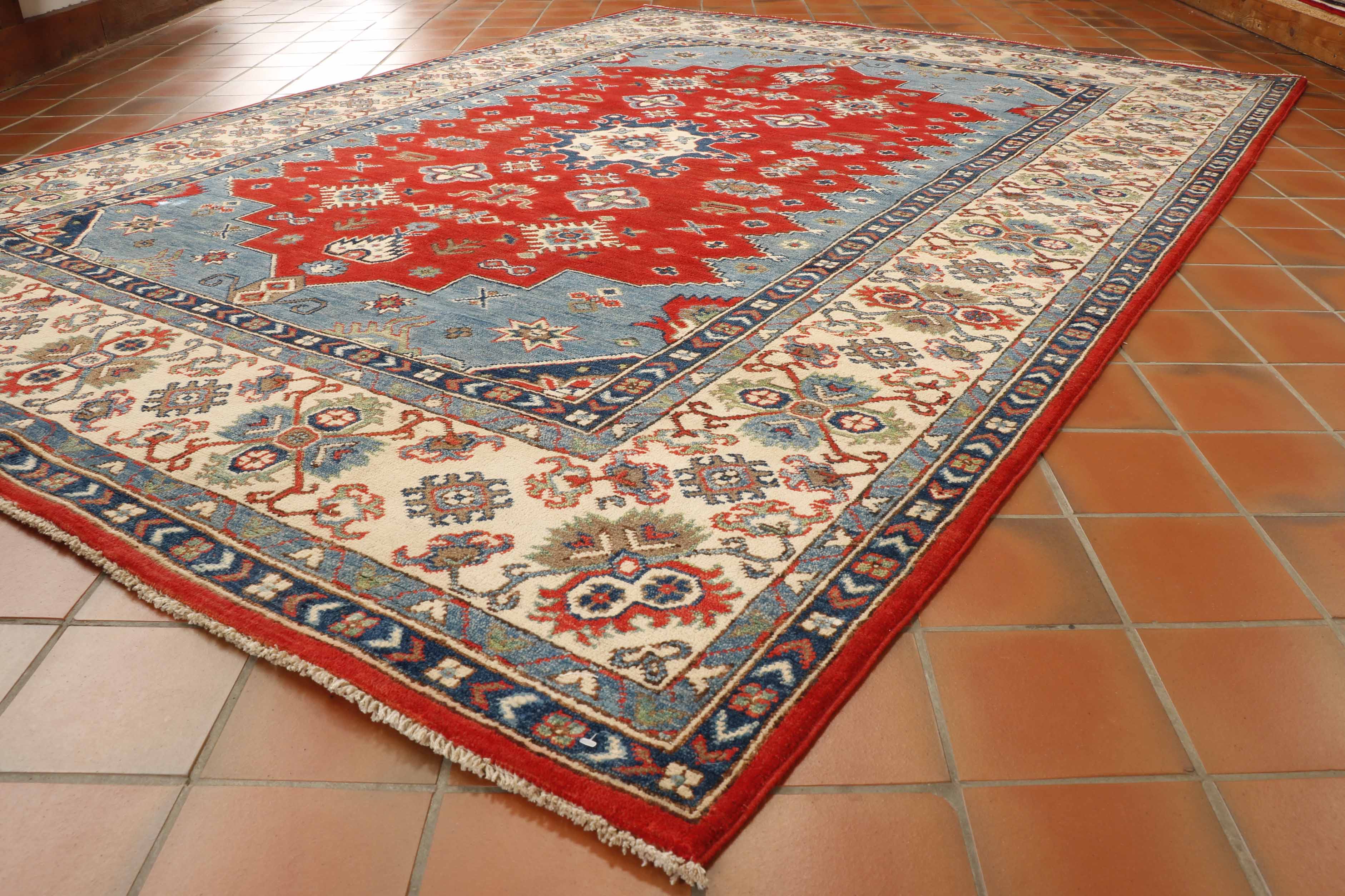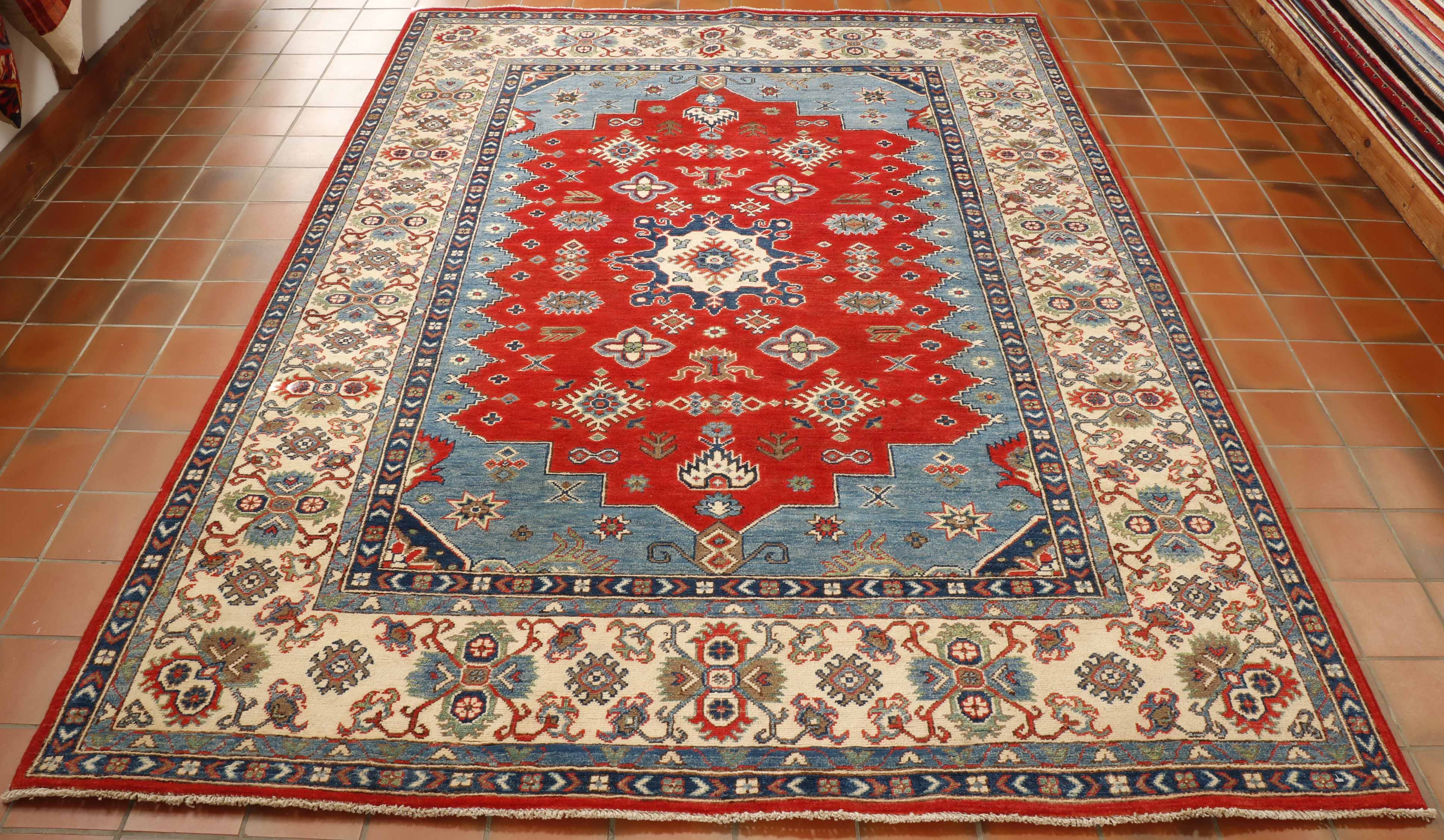 This Afghan Kazak is a good-quality handmade rug at a reasonable price. It is not as finely knotted as most of our Kazaks, which is why the price differs; however, to compensate, the pile has been left thicker. This is a great rug suitable for any location in the home. A cool blue-and-cream border complements its strong pinky-red ground colour.
