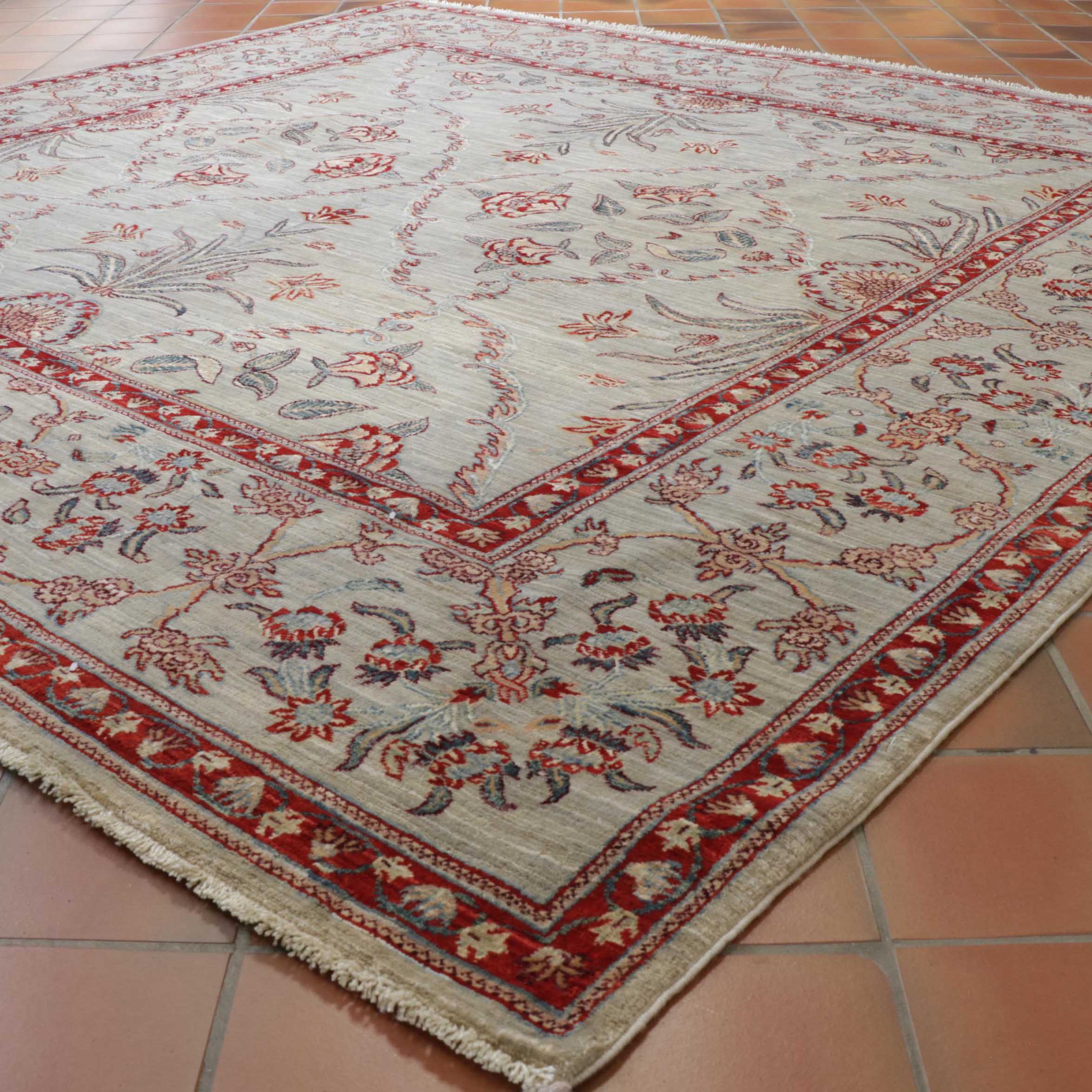 Afghan Aryana rugs are hand-knotted in Mazar-e-Sharif and Kabul, Afghanistan, often incorporating designs from museum pieces. Woven from long wool sheared from Karakul sheep, the wool is washed using a gentle soap with water, hand-combed, and hand-spun on a spindle. Next, the wool is vegetable-dyed using plants, flowers, berries, walnut husks, pomegranate rind, madder root, and indigo. Unsurprisingly, wools vary in colour due to differences in dye absorption, resulting in a feature known as 'Abrash' that gives A'yana rugs their unique colour and distinct appearance.