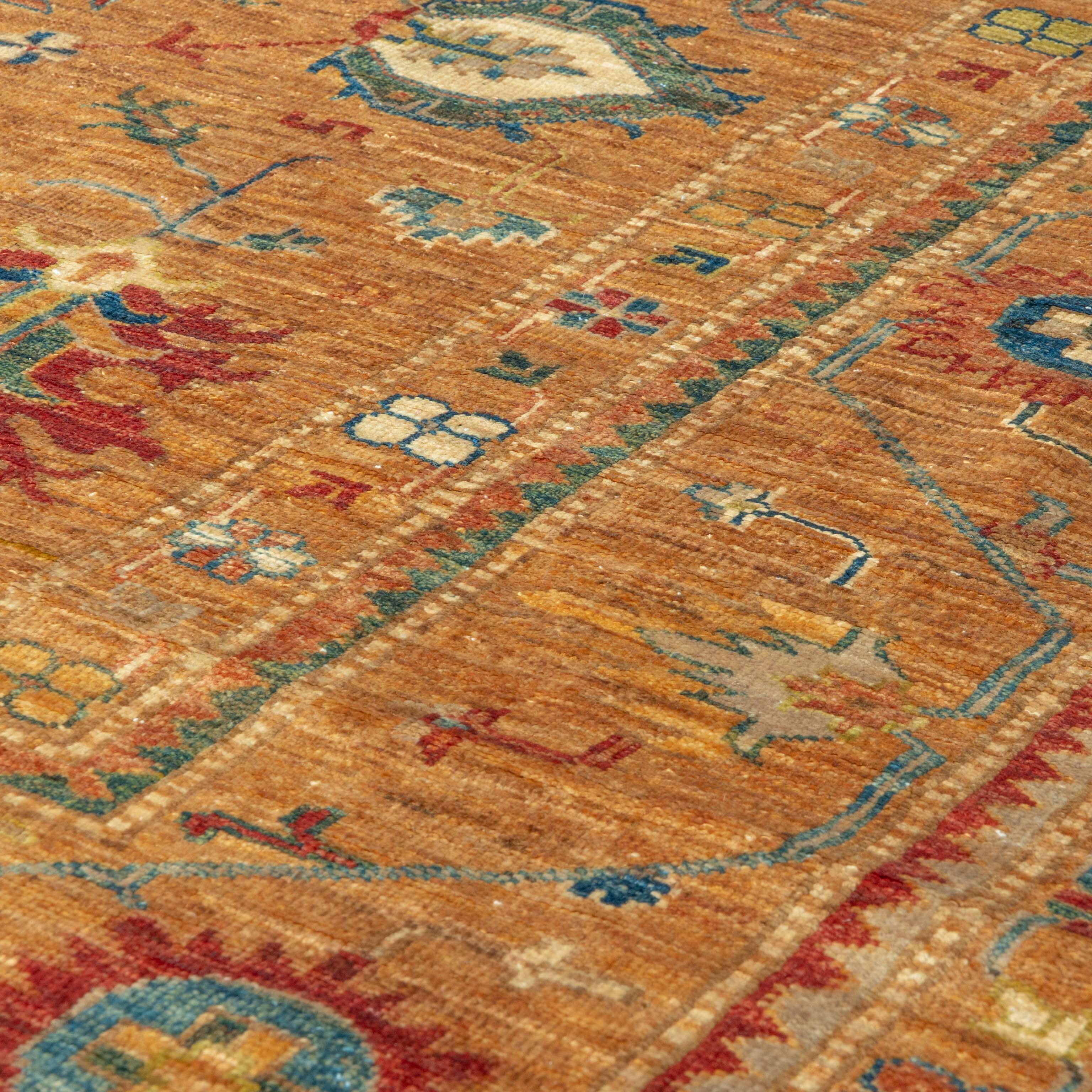 Although Kazaks are hand-knotted in Afghanistan, the design originates from the Caucasus. The short pile emphasises the pattern's sharpness. Each piece is made using excellent Afghan wool, usually spun in Ghazni. Afghan wool is generally slightly coarser and more curly than other wools, making it perfect for carpet weaving. Afghan Kazak carpets are traditionally made with bold geometric designs in intense, vibrant colours such as rich reds, warm terracottas, and shades of blues with soft golds and creams.