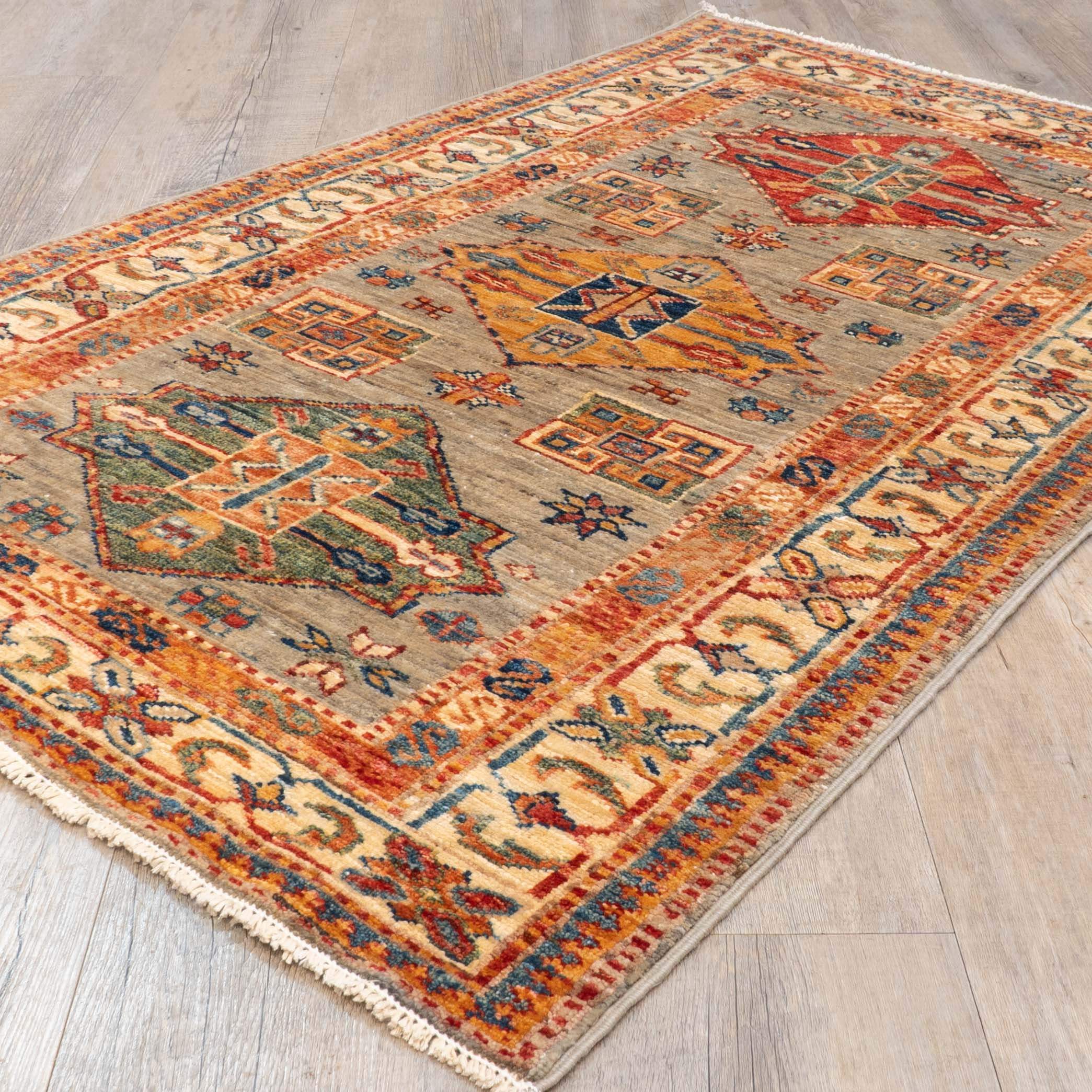 Crafted by skilled artisan weavers in northwest Afghanistan, this handmade extra fine Afghan Kazak rug showcases traditional geometric patterns inspired by classic Caucasian designs. Made from vegetable-dyed handspun wool, it features a soft palette of pale grey, old gold, cream, flame red and forest green highlights. Produced in a cottage industry that preserves generational weaving techniques, this rug offers practical durability and a beautiful lustre to the pile, reflecting exceptional quality and craftsmanship. Ideal for adding both artistry and resilience to any space.  Please click the hyperlinks below in gold for additional information.  We stock various grades of Kazak carpets,...