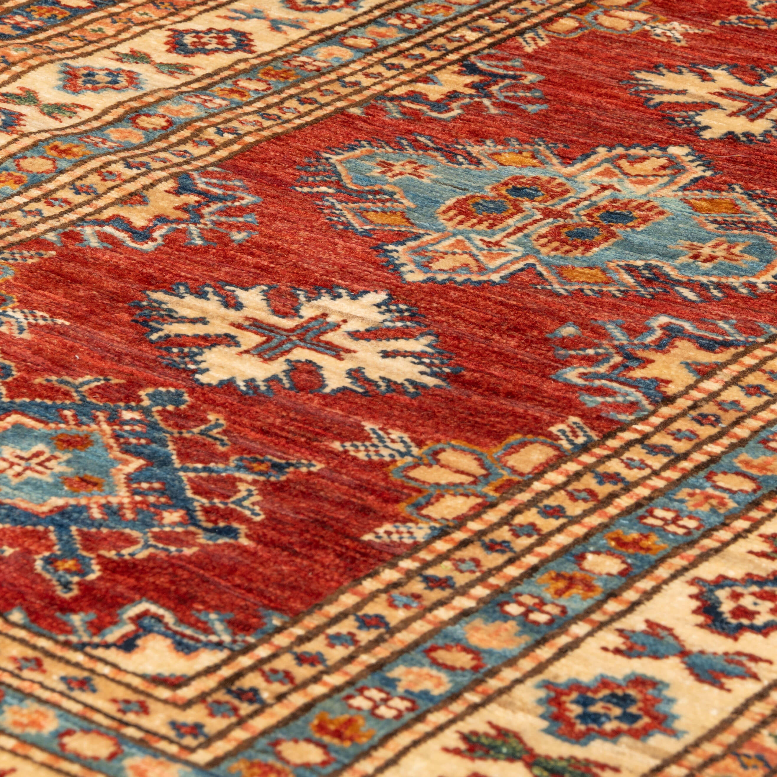 Although Kazaks are hand-knotted in Afghanistan, the design originates from the Caucasus. The short pile emphasises the sharpness of the pattern. Each piece is crafted from exceptional Afghan wool, typically spun in the Ghazni region. Afghan wool is generally slightly coarser and curlier than other wools, making it perfect for carpet weaving. Afghan Kazak carpets are traditionally made with bold geometric designs in intense, vibrant colours such as rich reds, warm terracottas, and shades of blues with soft golds and creams.