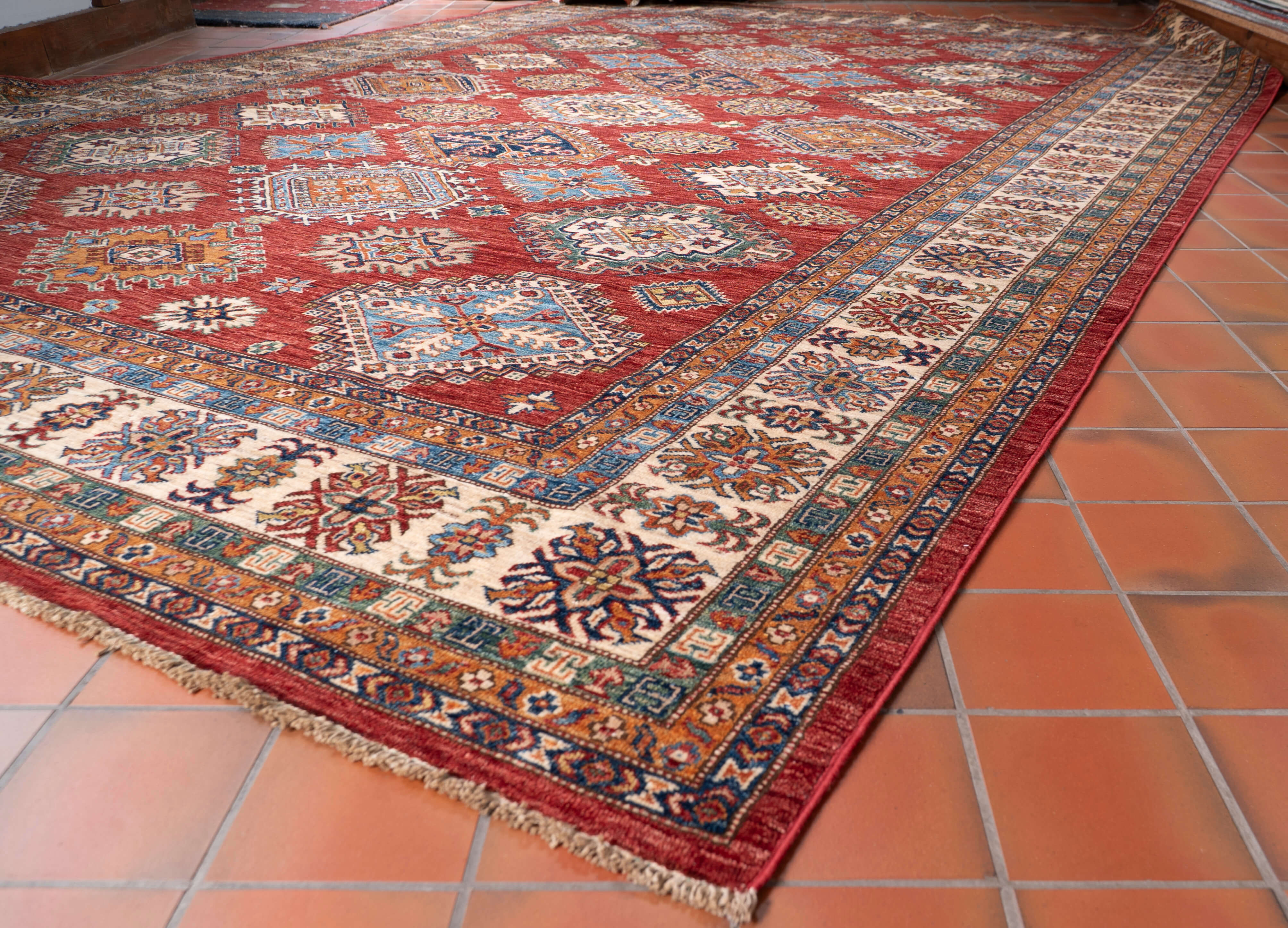 Although Kazaks are hand-knotted in Afghanistan, the design originates from the Caucasus. The short pile emphasises the sharpness of the pattern. Each piece is made using excellent Afghan wool, usually spun in Ghazni. Afghan wool is generally slightly coarser and curlier than other wools and is perfect for carpet weaving. Afghan Kazak carpets are traditionally made with bold geometric designs in intense, vibrant colours such as rich reds, warm terracottas, and shades of blues with soft golds and creams.