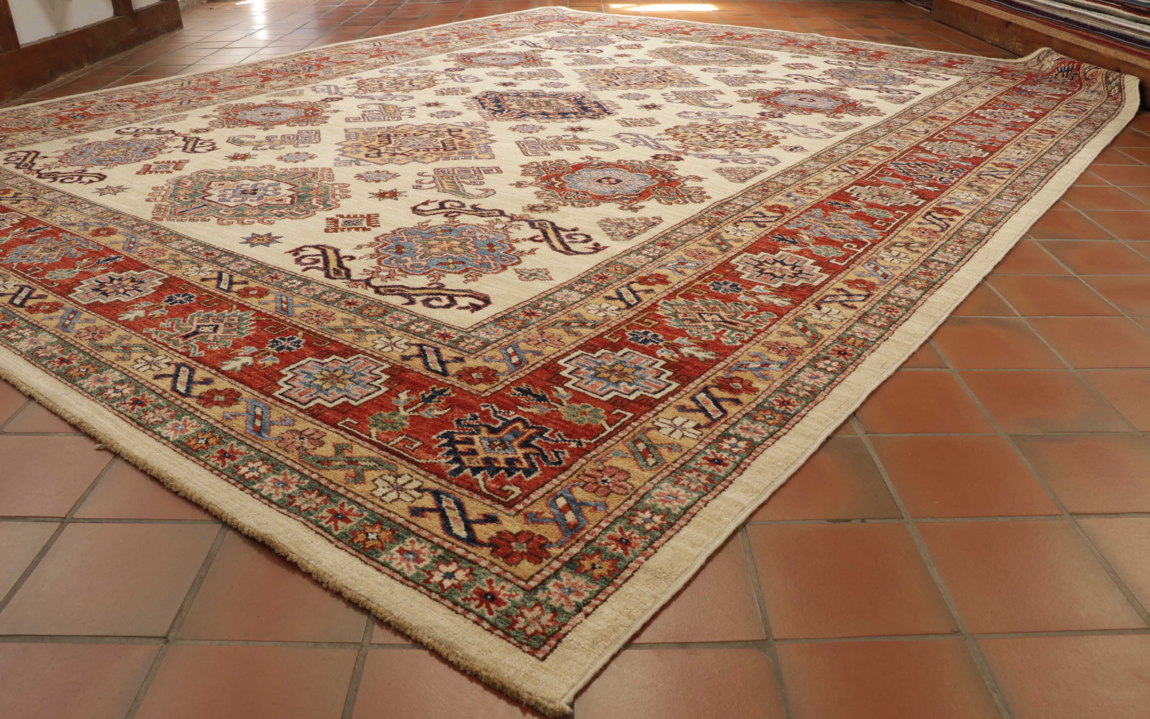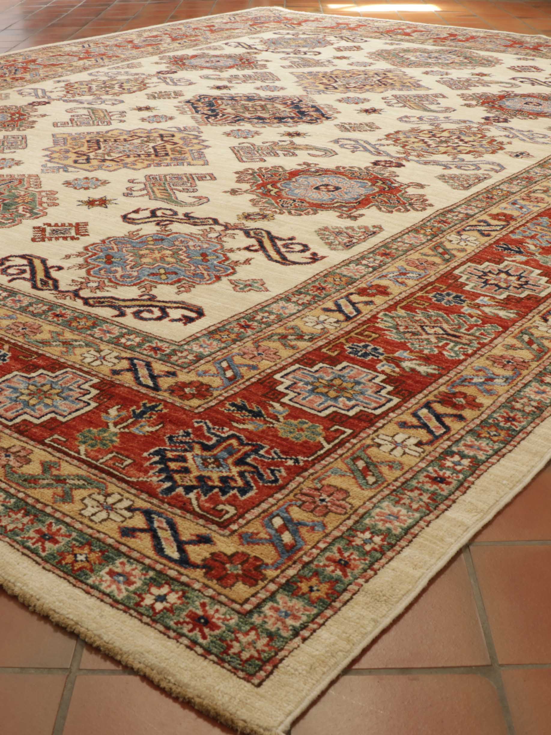 Although Kazaks are hand-knotted in Afghanistan, the design originates from the Caucasus. The short pile emphasises the pattern's sharpness. Each piece is made using excellent Afghan wool, usually spun in Ghazni. The Afghan wool is generally slightly coarser and more curly than other wools and is perfect for carpet weaving. Afghan Kazak carpets are traditionally made with bold geometric designs in intense, vibrant colours such as rich reds, warm terracottas, and shades of blues with soft golds and creams.