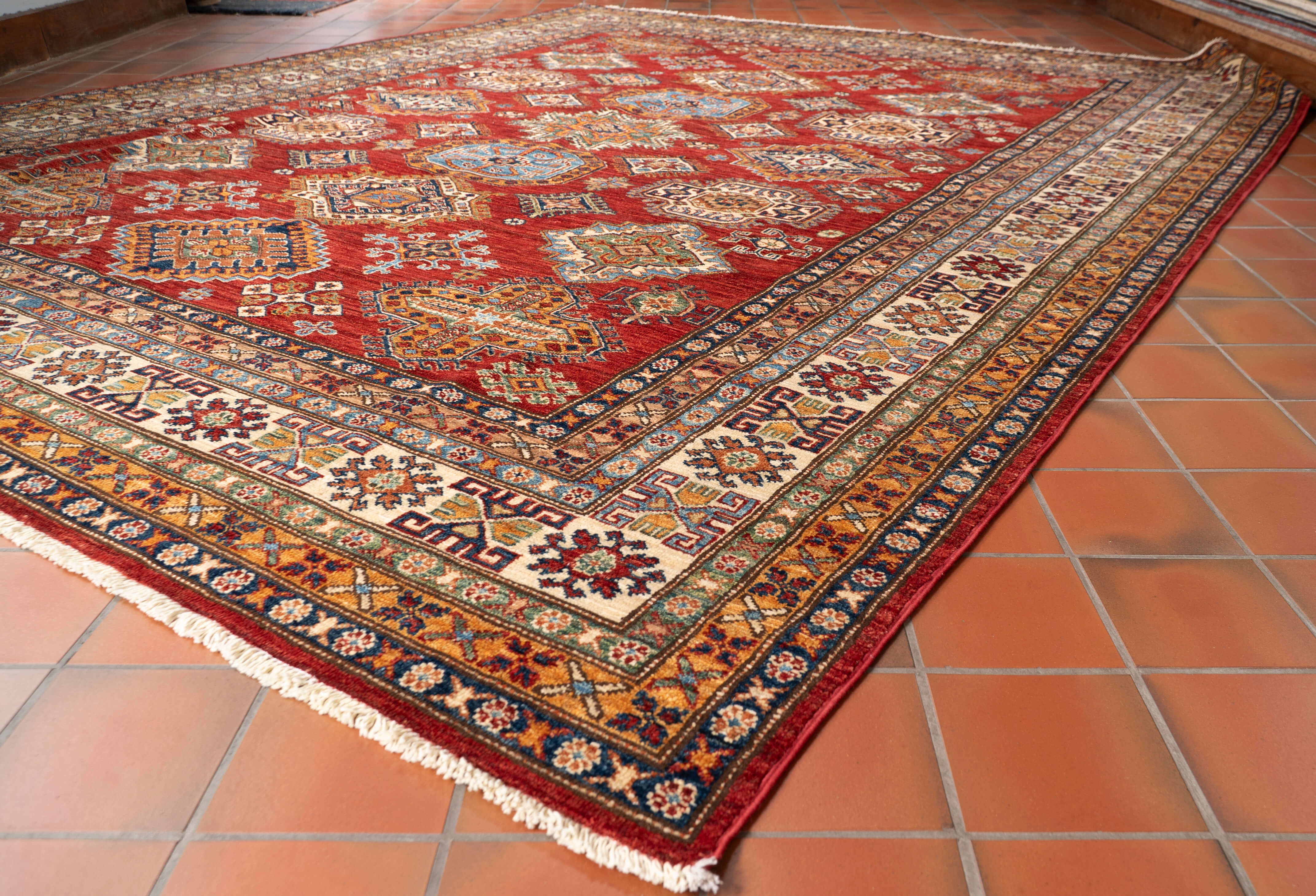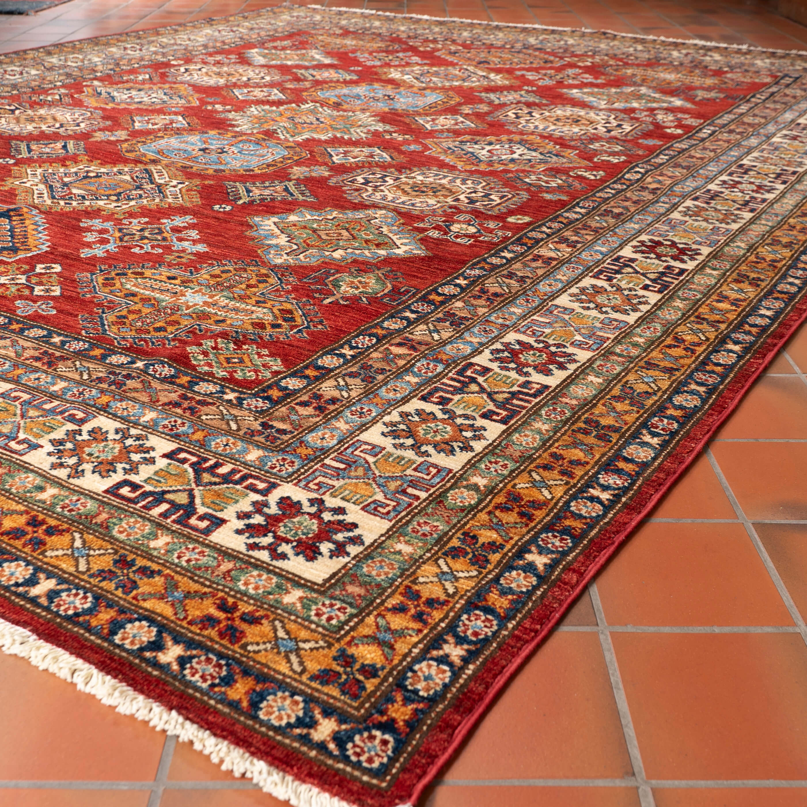 Although Kazaks are hand-knotted in Afghanistan, the design originates from the Caucasus. The short pile emphasises the pattern's sharpness. Each piece is made from high-quality Afghan wool, typically spun in Ghazni. Afghan wool is generally slightly coarser and curlier than other wools, making it perfect for carpet weaving. Afghan Kazak carpets are traditionally made with bold geometric designs in intense, vibrant colours such as rich reds, warm terracottas, and shades of blues with soft golds and creams.