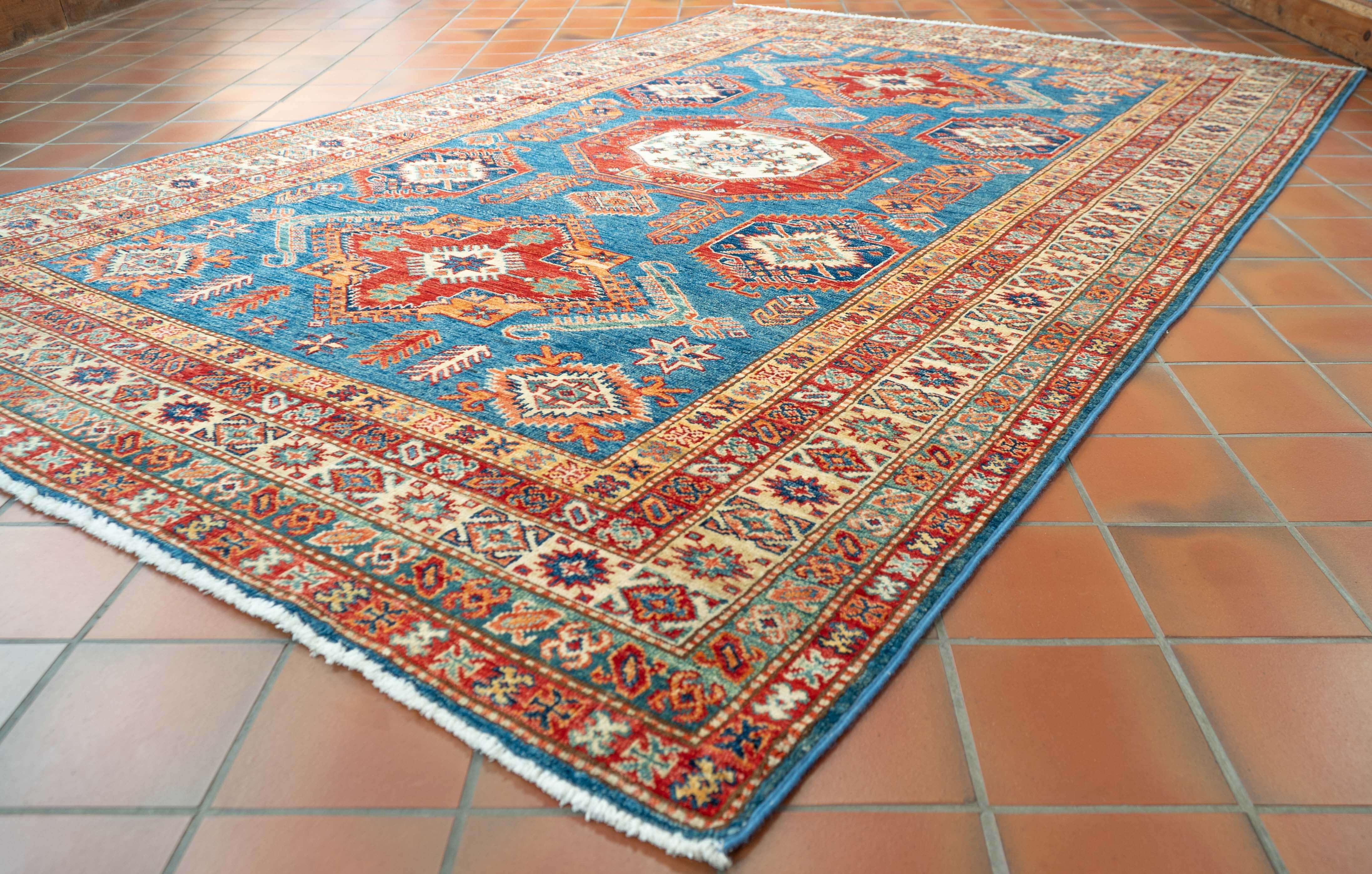 Handcrafted in northwest Afghanistan by skilled artisan weavers, this fine Kazak rug exemplifies traditional weaving heritage passed through generations. Woven from vegetable-dyed handspun wool, it features authentic geometric patterns inspired by classic Caucasian designs. The striking colour palette combines a mid-blue background with rich red, gold, apricot, cream and subtle green accents, creating visual depth and warmth. Built to withstand daily use, this hardwearing piece develops a beautiful lustre with time. Each rug represents the culmination of traditional craftsmanship and fine quality construction, making it both a practical investment and a distinctive statement for any interior.