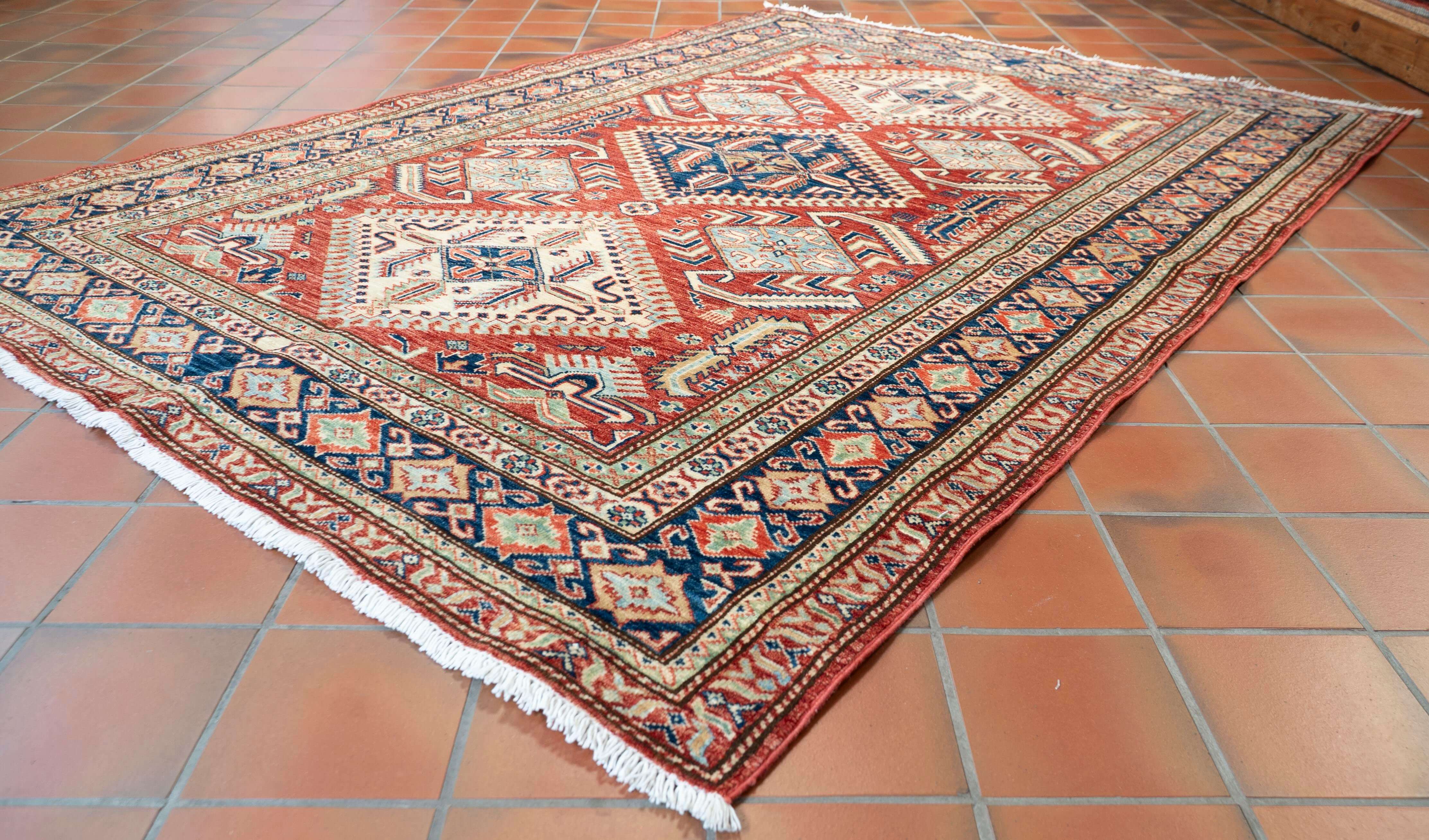 Although Kazaks are hand-knotted in Afghanistan, the design originates from the Caucasus. The short pile emphasises the sharpness of the pattern. Each piece is made using excellent Afghan wool, usually spun in Ghazni. The Afghan wool is generally slightly coarser and more curly than other wools and is perfect for carpet weaving. Afghan Kazak carpets are traditionally made with bold geometric designs in intense, vibrant colours such as rich reds, warm terracottas, and shades of blues with soft golds and creams.