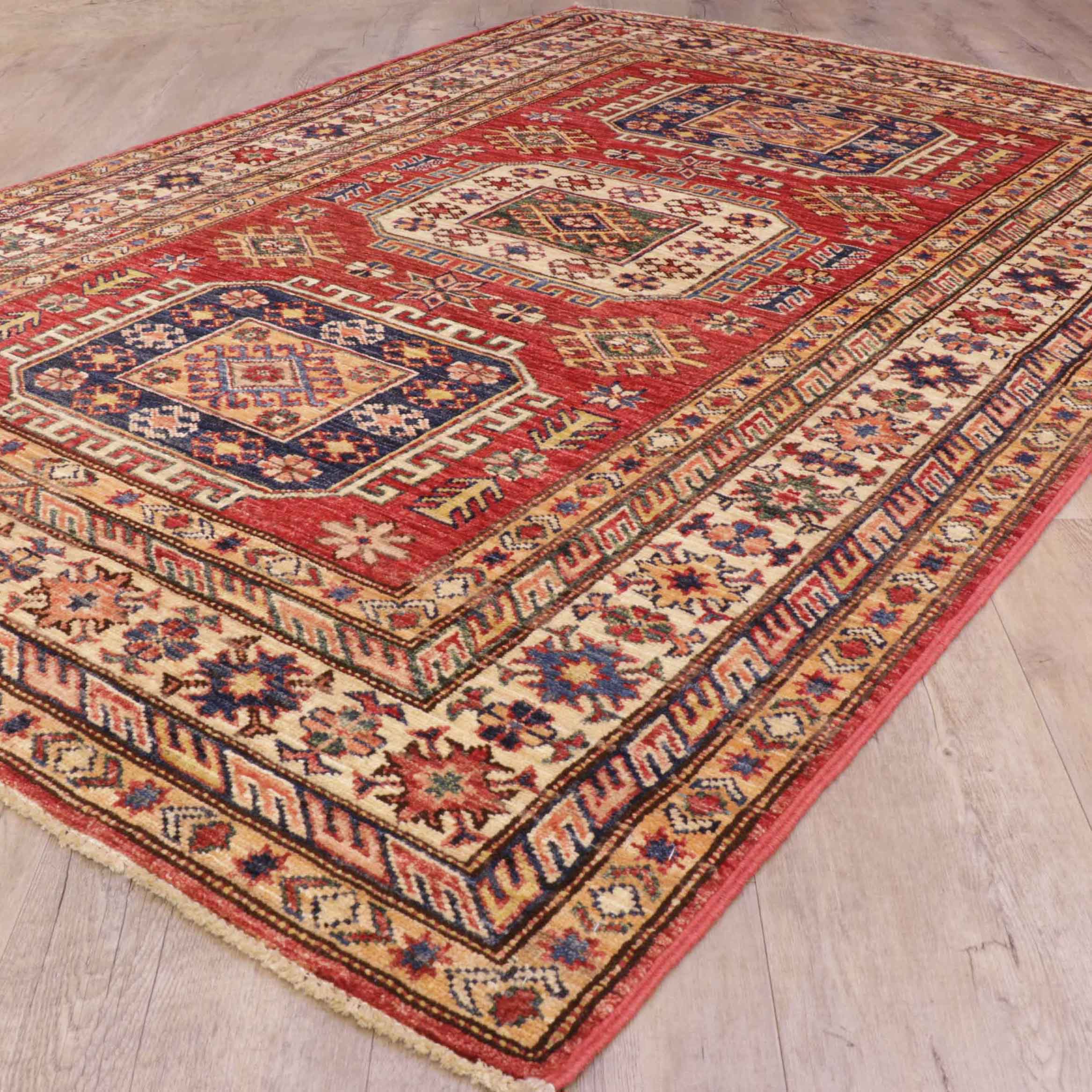 Handcrafted in northwest Afghanistan, our fine Afghan Kazak rug is produced within a rich cottage industry, preserving traditional skills passed down through generations. This durable rug is made from vegetable-dyed handspun wool and has a practical, hardwearing quality. Its traditional geometric design, inspired by classic Caucasian patterns, features a soft red background complemented by gold, cream, dark blue tones, and hints of green. Elevate your home with this colourful, high-quality addition. Please click the hyperlinks below in gold if you want additional information.  Although Kazaks are hand-knotted in Afghanistan, the design originates from the Caucasus. The short pile emphasises the sharpness...
