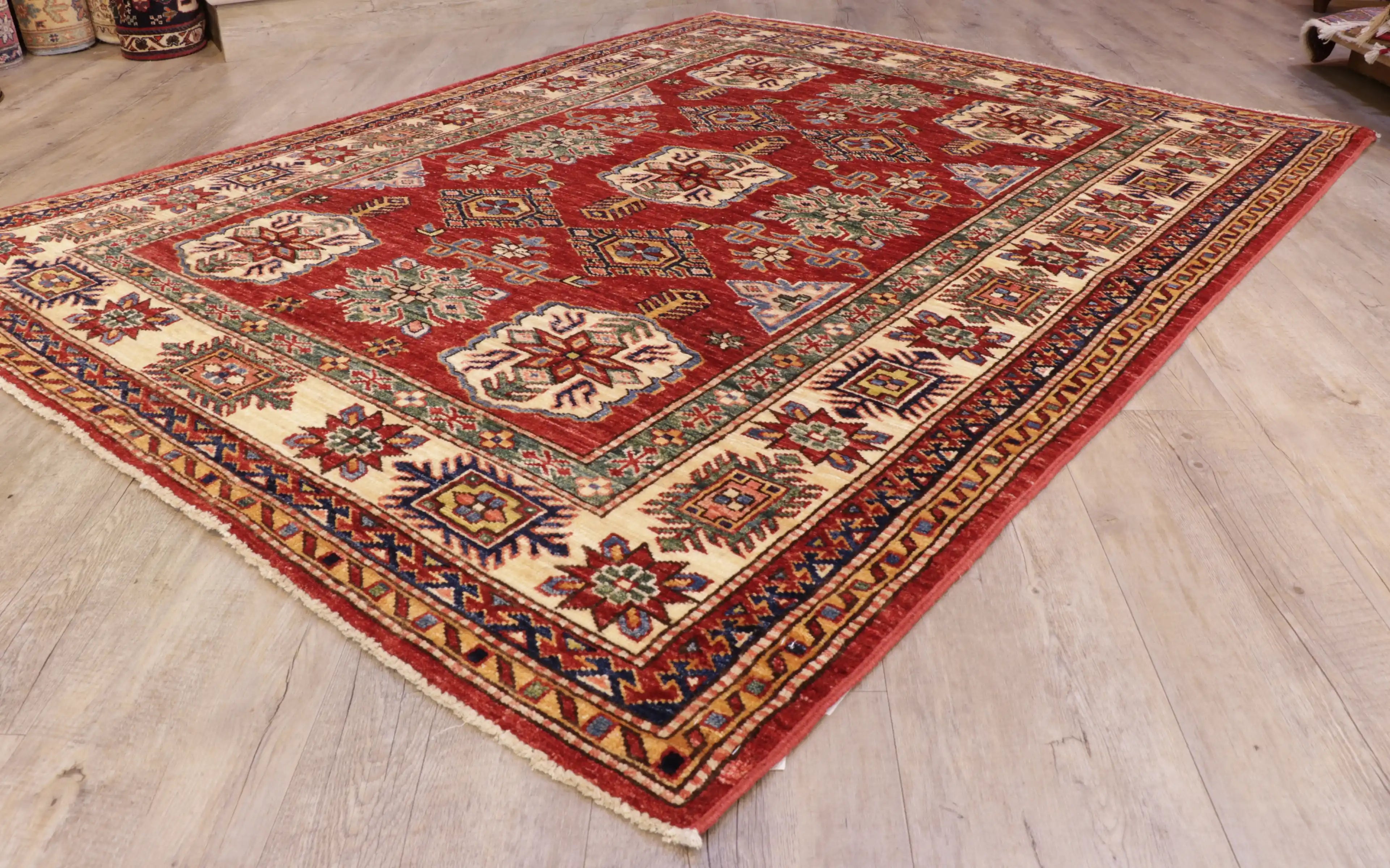 This handmade fine Afghan Kazak rug is crafted by skilled artisan weavers in northwest Afghanistan, using traditional techniques passed down for generations. Made from vegetable-dyed handspun wool and featuring a traditional geometric design, this rug boasts a striking colour palette of rich red, gold, cream, and green. Its fine quality and beautiful lustre make it a practical and hardwearing addition to any space. Please click the gold hyperlinks below for additional information.  Although Kazaks are hand-knotted in Afghanistan, the design originates from the Caucasus. The short pile emphasises the sharpness of the pattern. Each piece is made using excellent Afghan wool, usually spun in...
