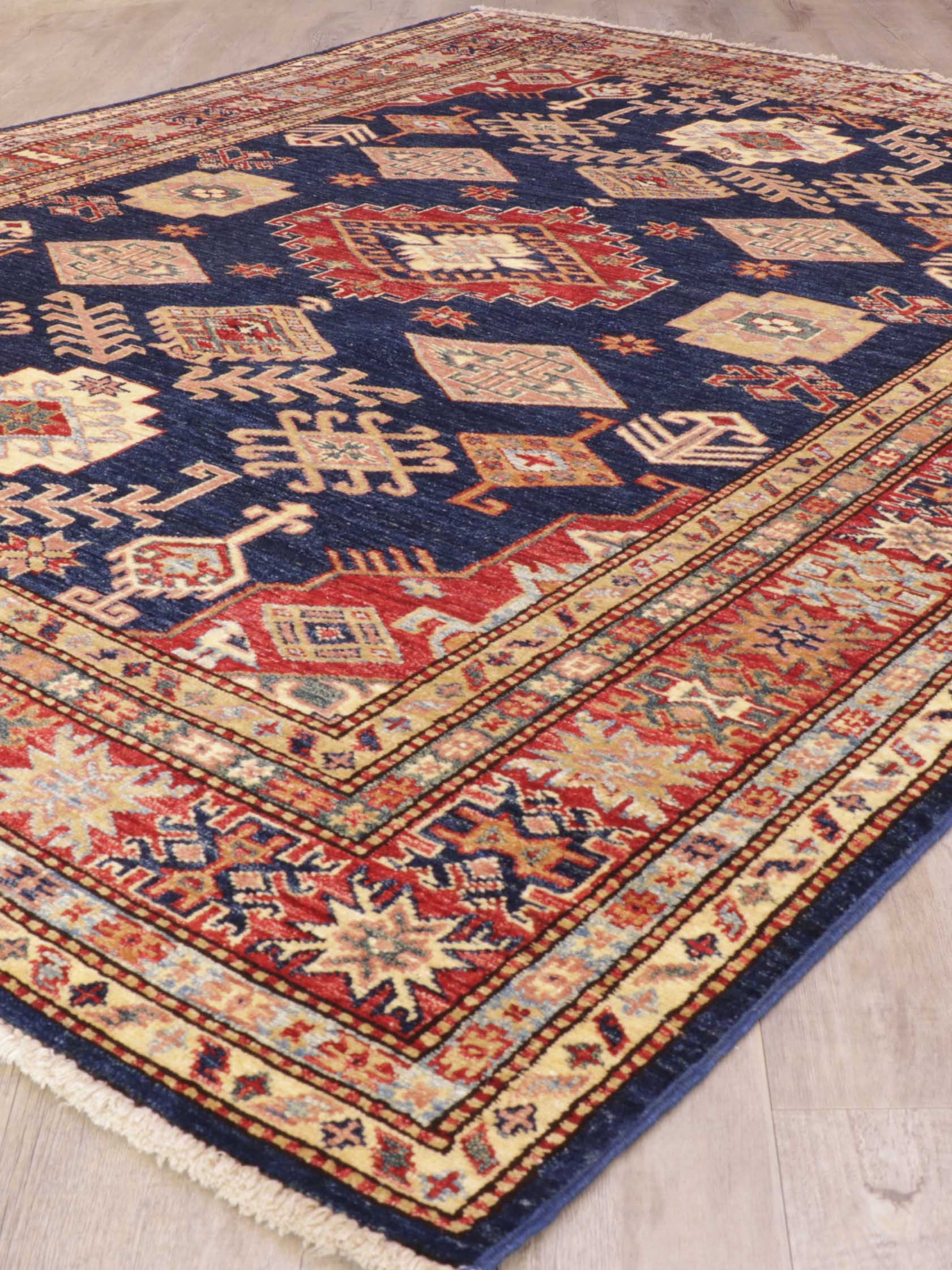 Expertly crafted by skilled artisan weavers in northwest Afghanistan, this handmade Kazak rug is a testament to traditional craftsmanship. This rug is made from vegetable-dyed handspun wool and features a stunning geometric design inspired by classic Caucasian styles. Its striking colour palette, including dark navy blue, warm red, gold, cream, and green touches, adds vibrancy to any space. Not only is it a beautiful statement piece, but it is also practical and hardwearing, perfect for any home. This rug is a true work of art with its fine quality and lustrous pile.