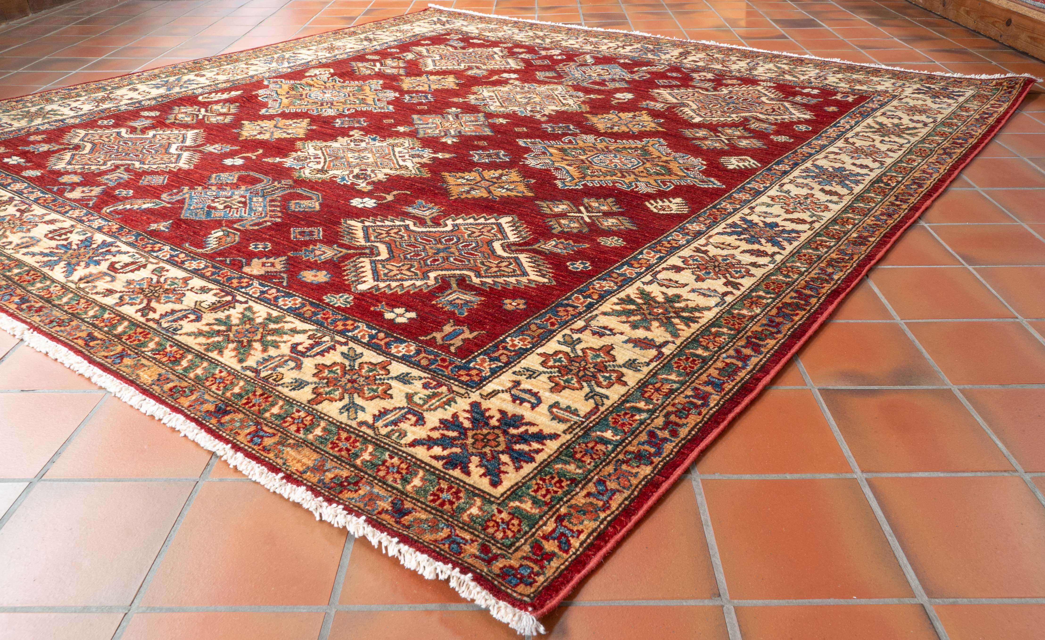 This exquisite Afghan Kazak square rug showcases traditional geometric motifs in luminous red tones, handwoven by master craftspeople. Its commanding presence transforms any room into a gallery-worthy display, whether placed in your lounge, bedroom, or home office. The square silhouette anchors interiors with architectural elegance, while the vibrant palette adds warmth and personality. Crafted with meticulous attention to detail, every rug is a one-of-a-kind treasure that marries heritage techniques with enduring appeal. Invest in a piece that speaks to refined taste and appreciation for authentic artisanal work.