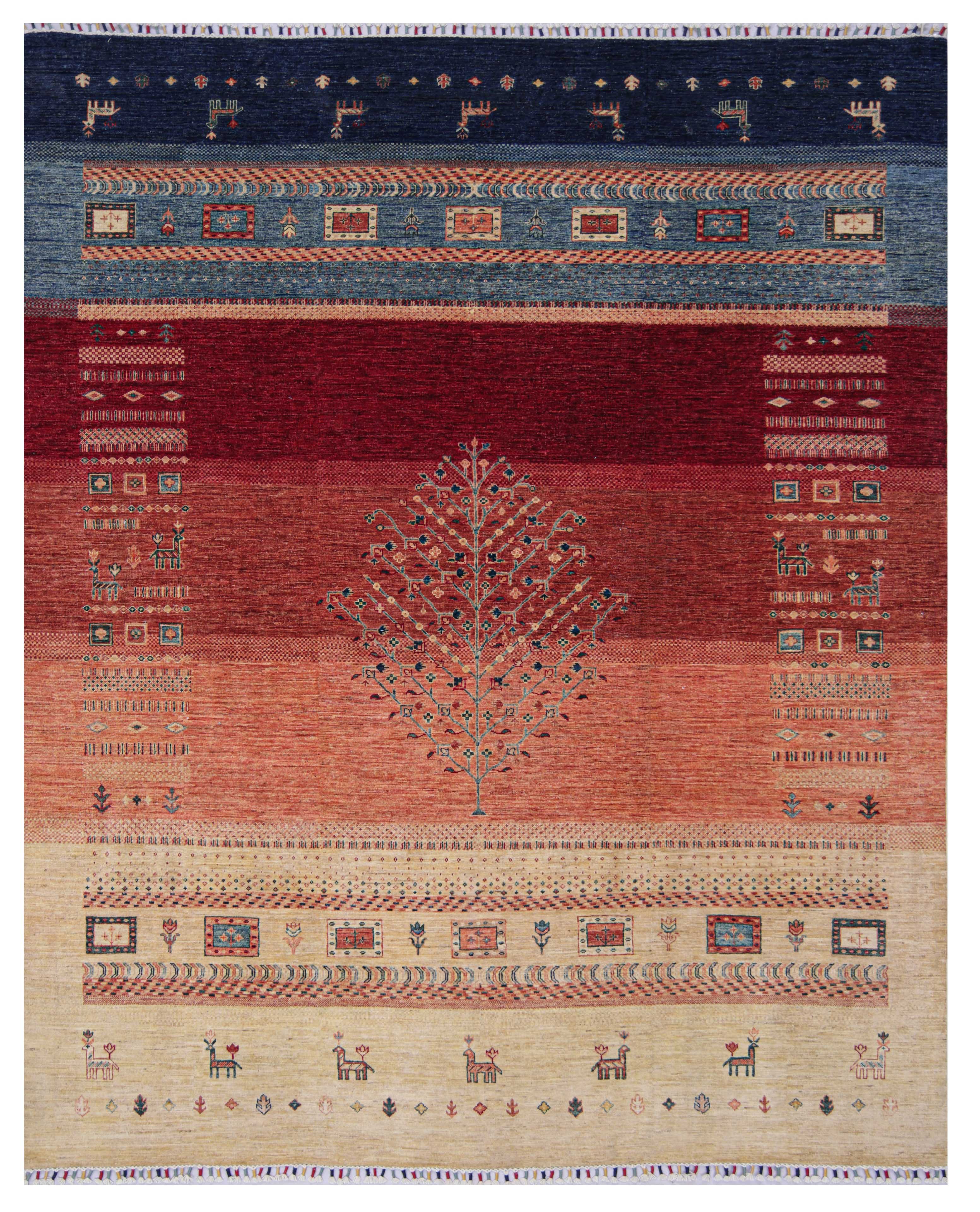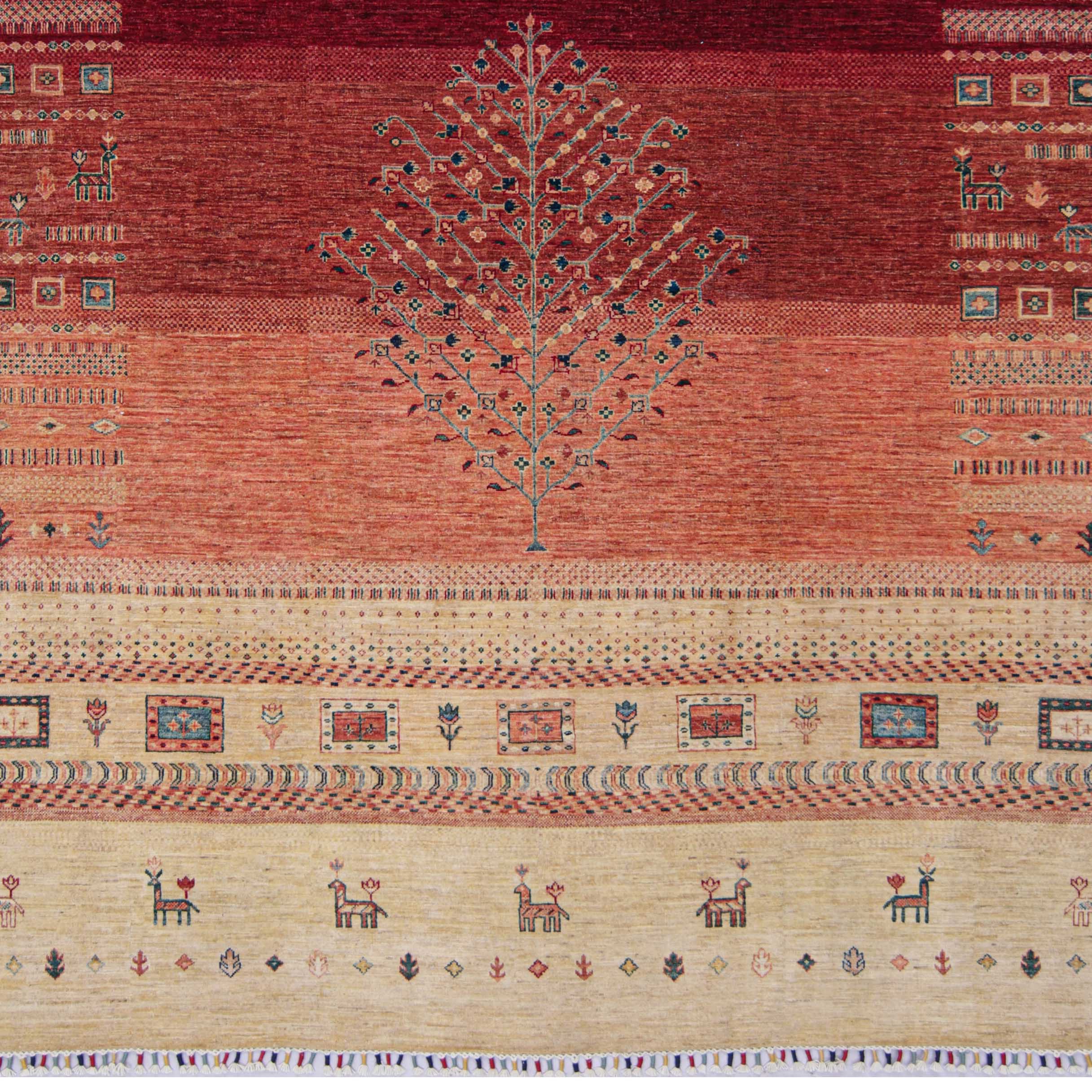 The carpets are still hand-knotted, and the wool is coloured with vegetable dye. The Loribaft rug designs can be reminiscent of Gabbeh designs, although the Loribaft pieces are more refined and tightly knotted. The colours of the Loribaft rugs and carpets are similar to those used in our Samarkand collections and possibly more vibrant. The main distinction is that the patterns are playful, using a defined colour palette and simple design, with stylised animals, plants, trees or characters with block colour often mimicking an ombre effect. Some Loribaft pieces do not have fringes, so they are finished with a plain kilim end or binding and secured to prevent fraying. Like the Samarkand carpets, other rugs are produced with an unusual bobbin wind on the warps.